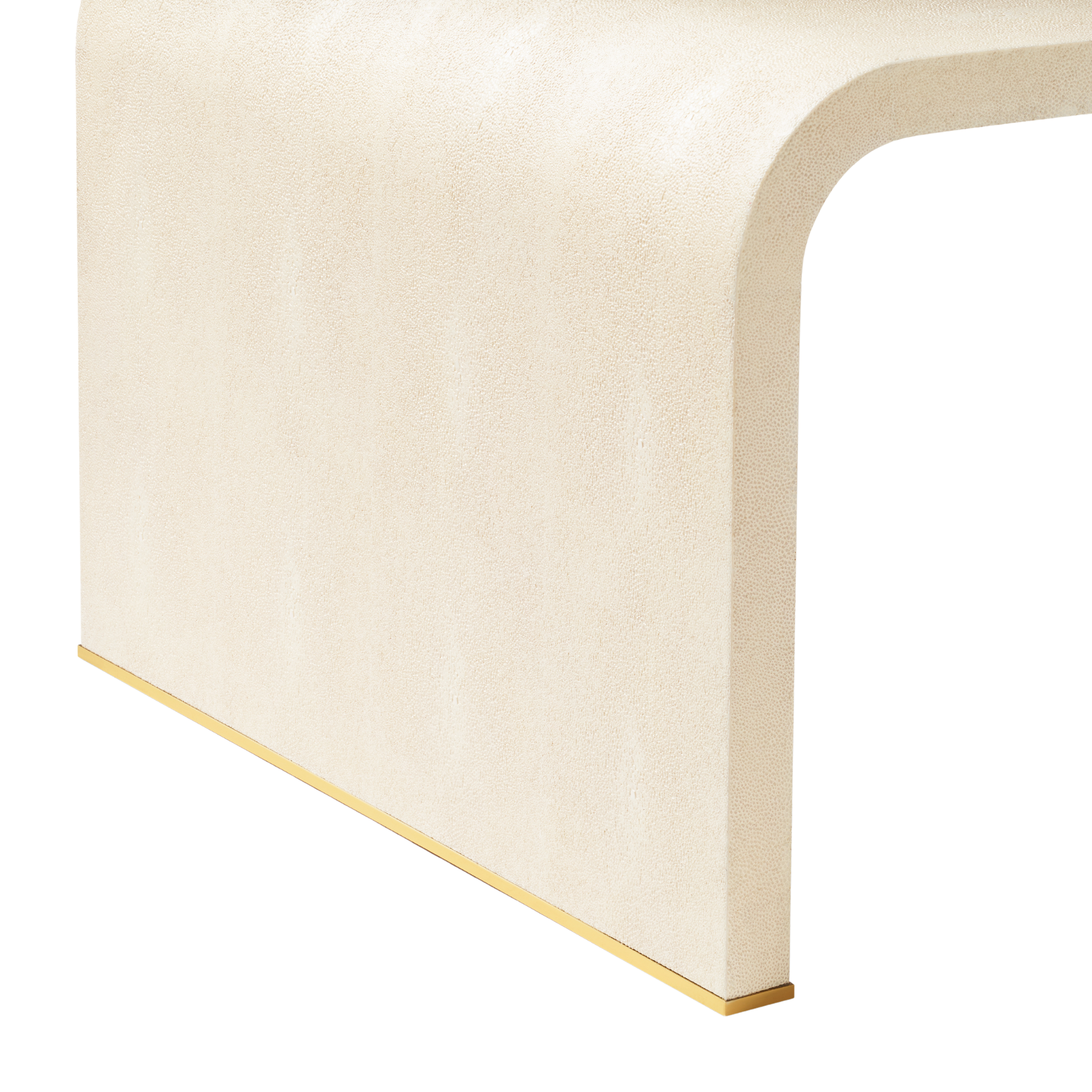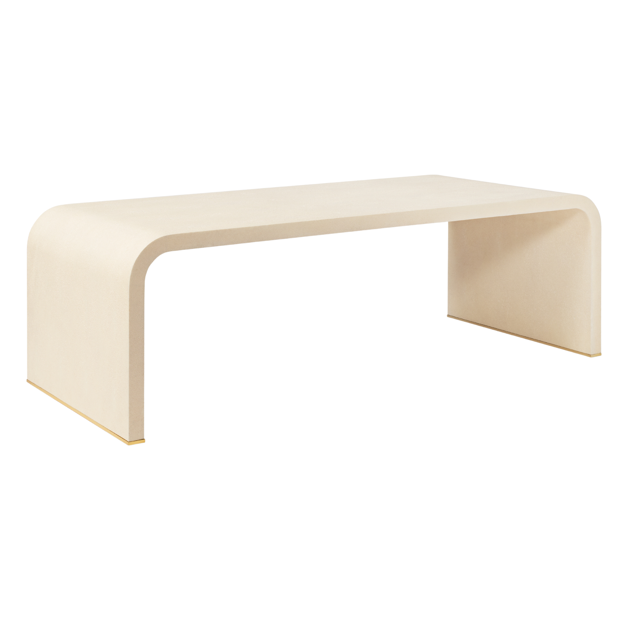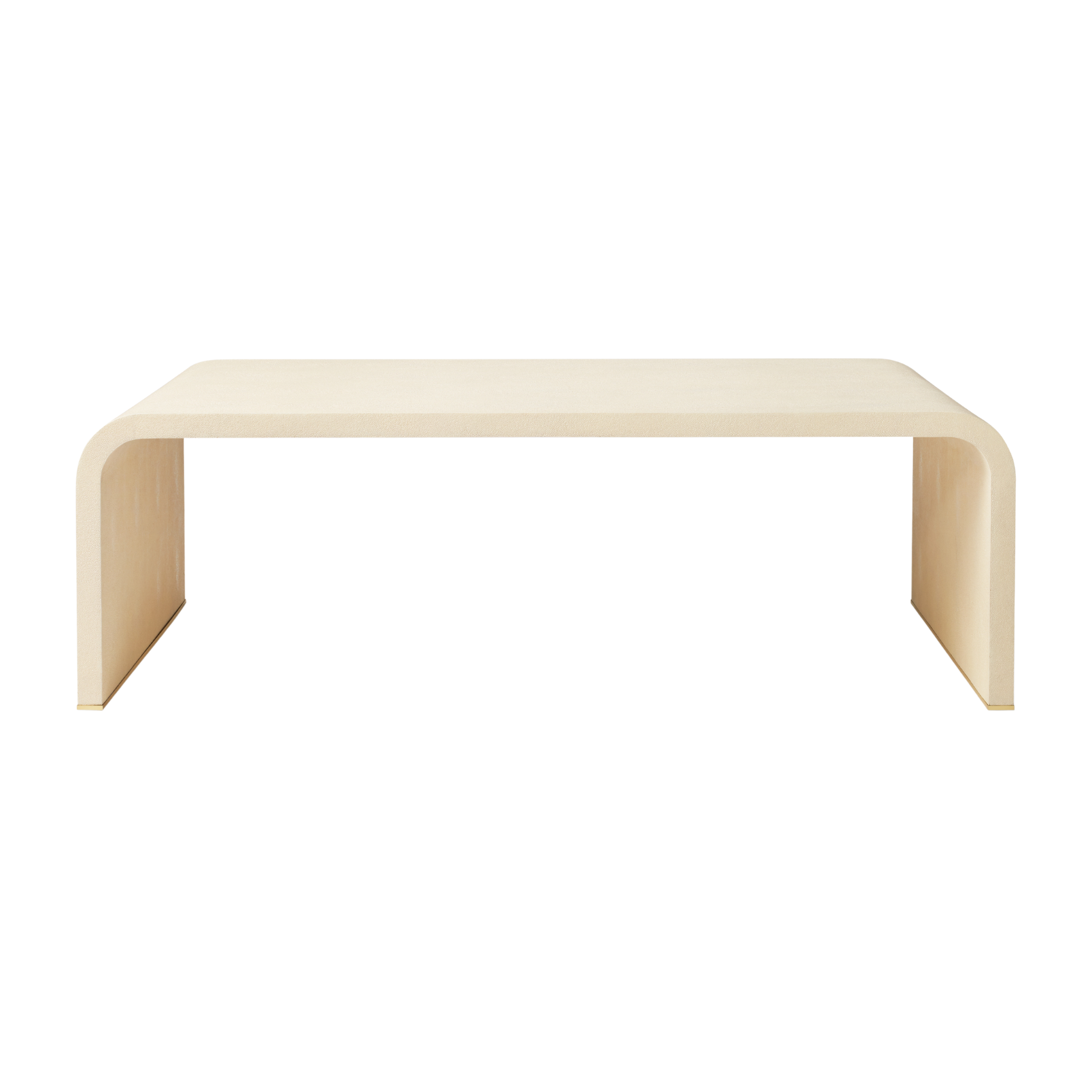 This versatile coffee table adds a stylish touch to a living room, study, or anywhere a low table is required. Finished in luxurious shagreen, its minimalist silhouette is enhanced with curved corners and brass detailing at the base.