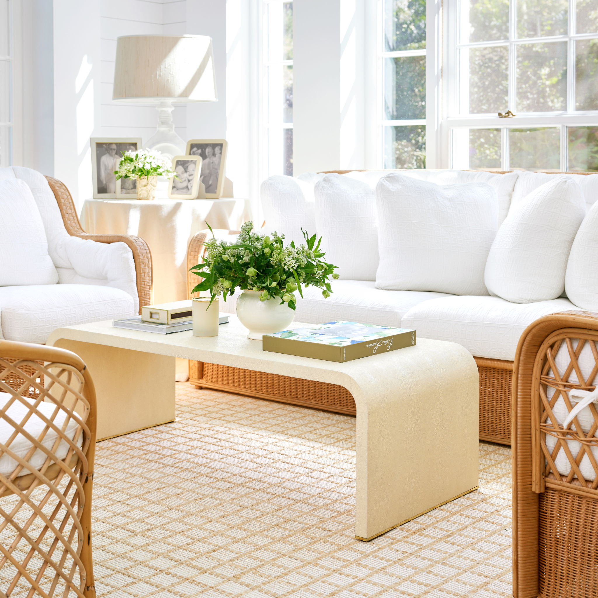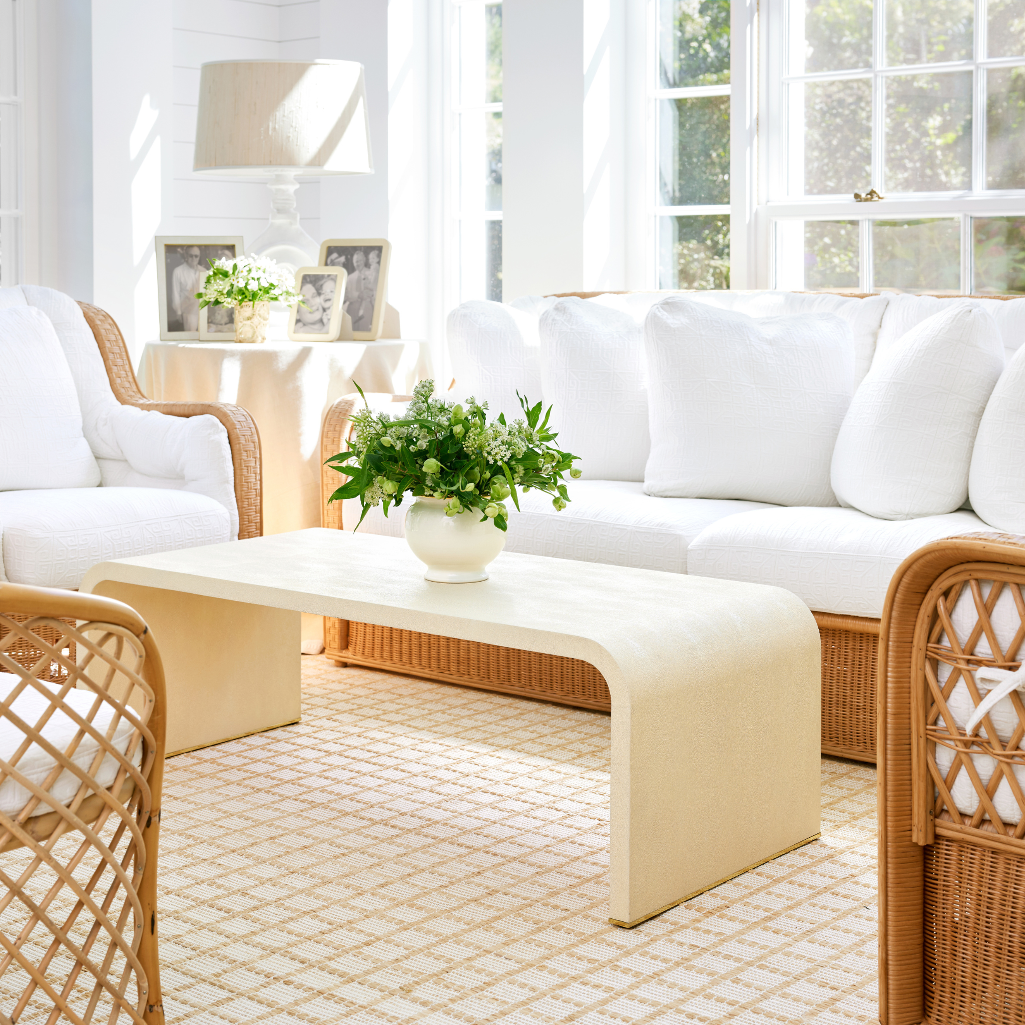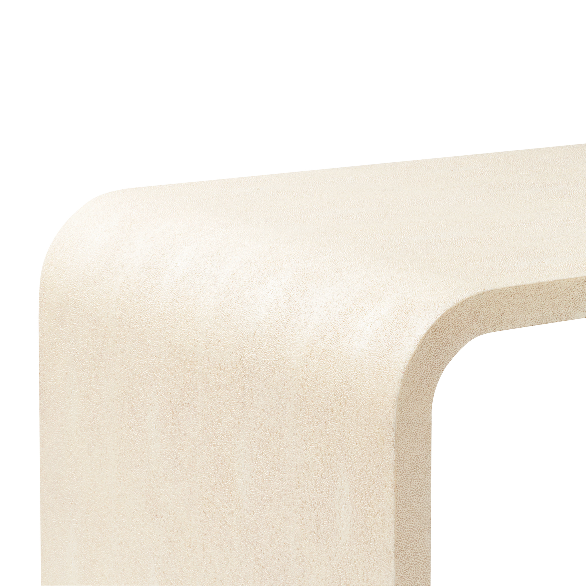 This versatile coffee table adds a stylish touch to a living room, study, or anywhere a low table is required. Finished in luxurious shagreen, its minimalist silhouette is enhanced with curved corners and brass detailing at the base.