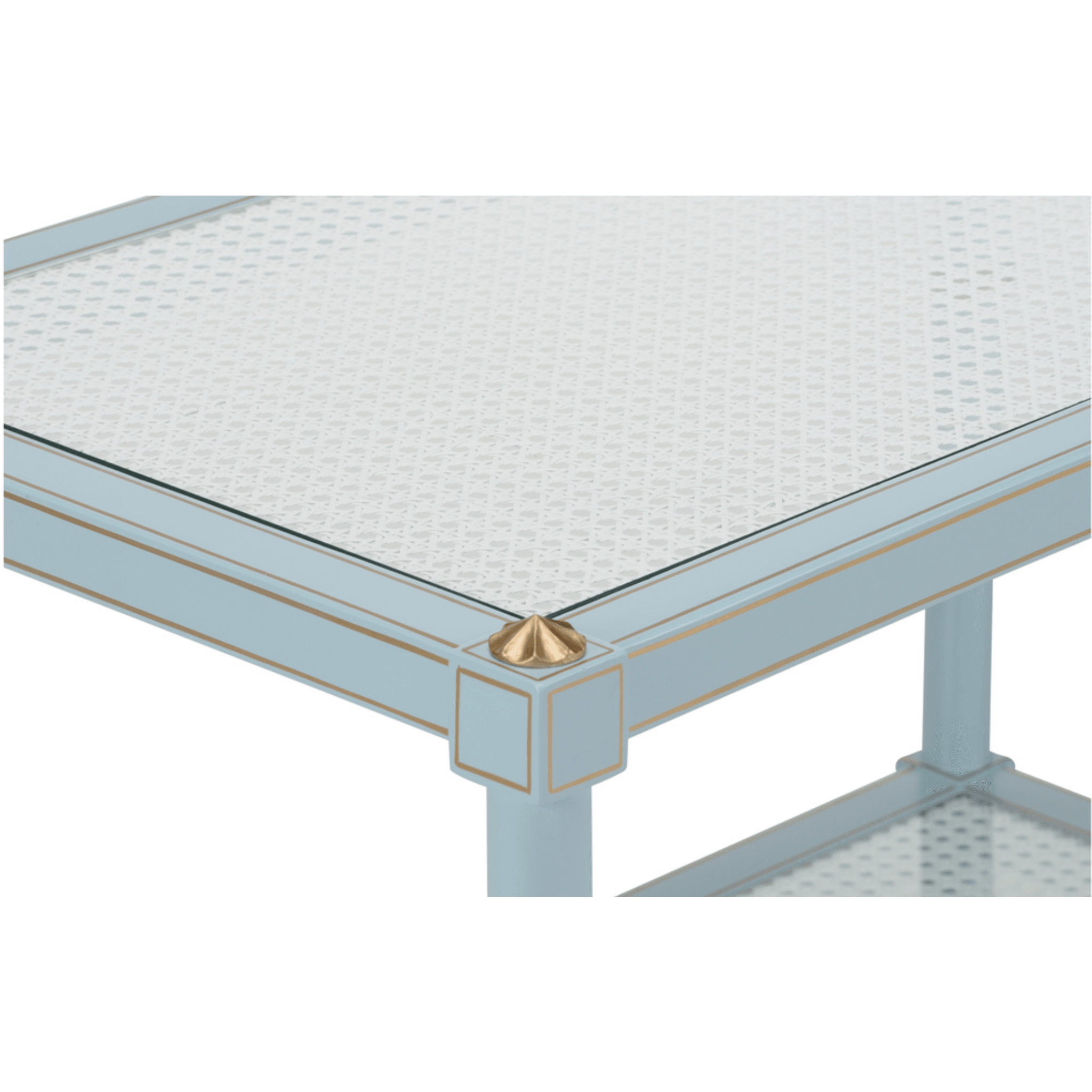 This wood and cane cocktail table is a beautiful & functional accent for living rooms and bedrooms alike. The gold accents add a stylish touch, while the sky blue finish adds a fresh look for your favorite space.