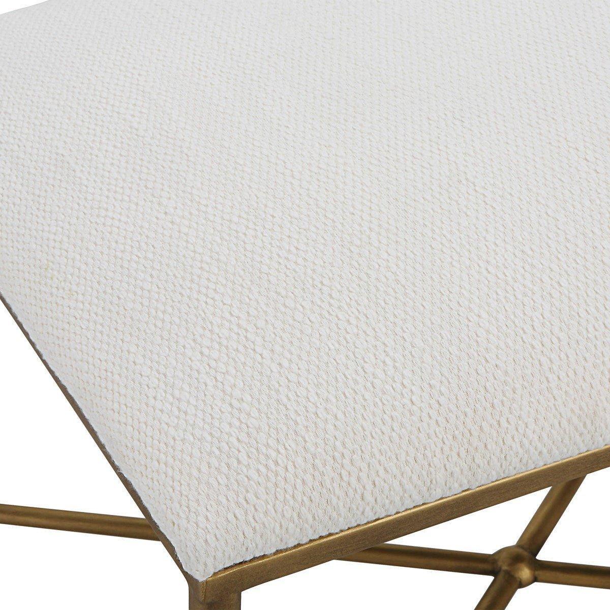 Thoroughly modern yet inspired by the classics, this small bench displays a stylish iron frame in a rich antique gold finish, upholstered in a crisp white textured fabric.