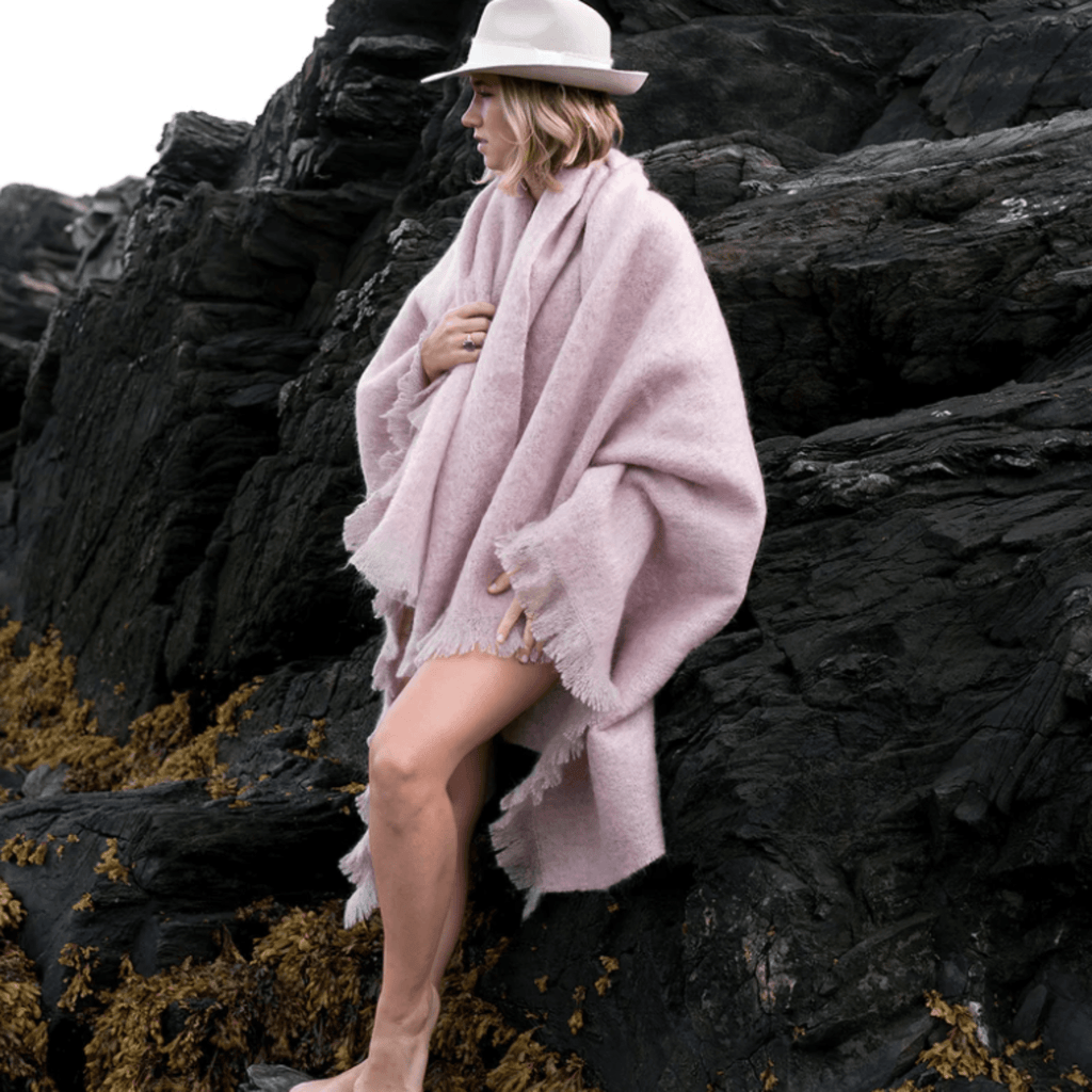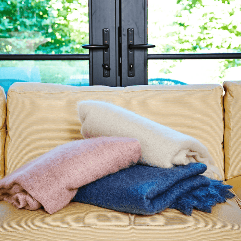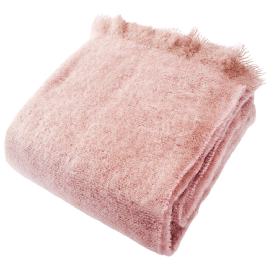 This luxurious woven mohair and wool blend throw is the ultimate in softness and comfort. The soft rose weave is finished with cut fringe. Click images for greater detail.