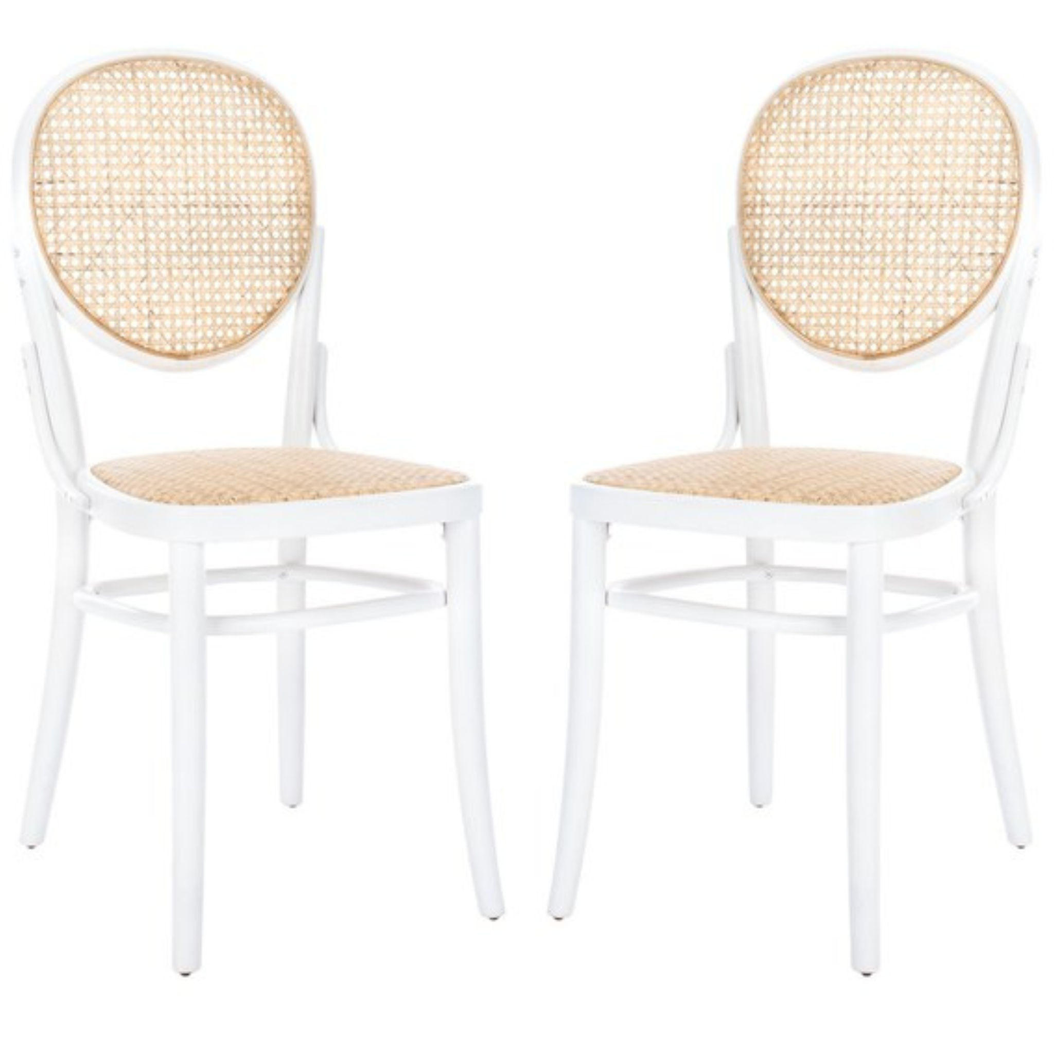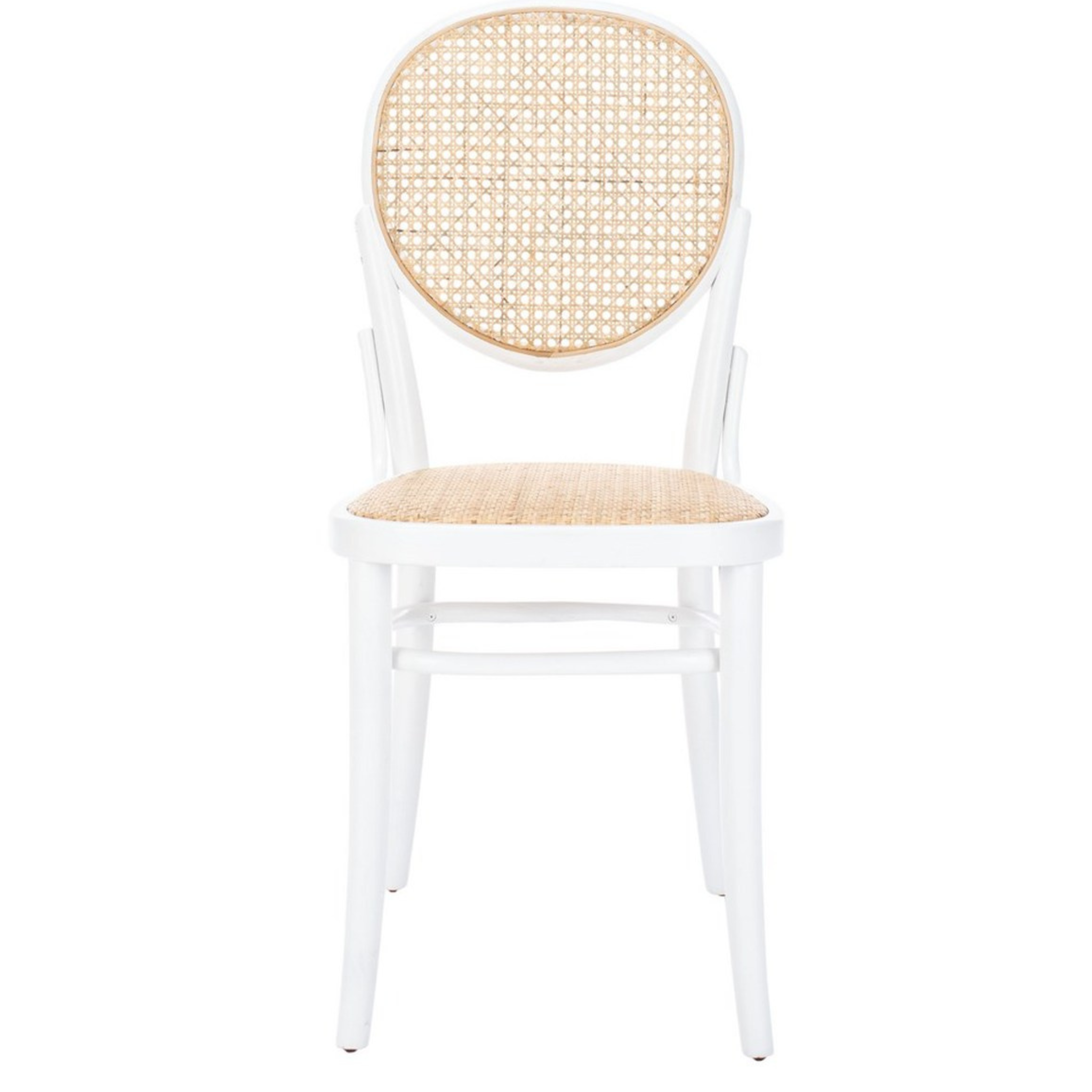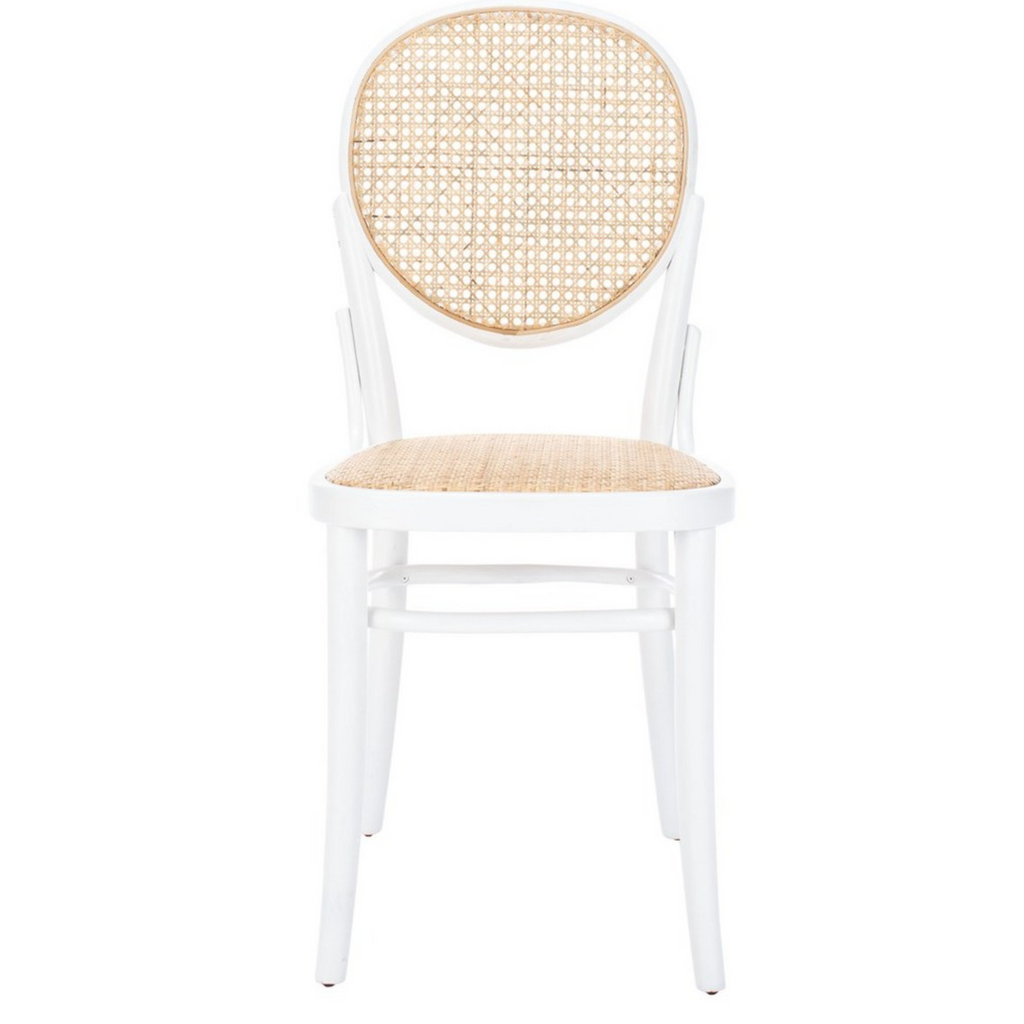 A true visual delight, this luxurious contemporary cane dining chair is crafted for the modern tastemaker. Featuring a graceful oval back that highlights its intricately woven natural cane, it's elegantly framed by the smooth, flowing curves of bright white wood. Click on images for greater detail.