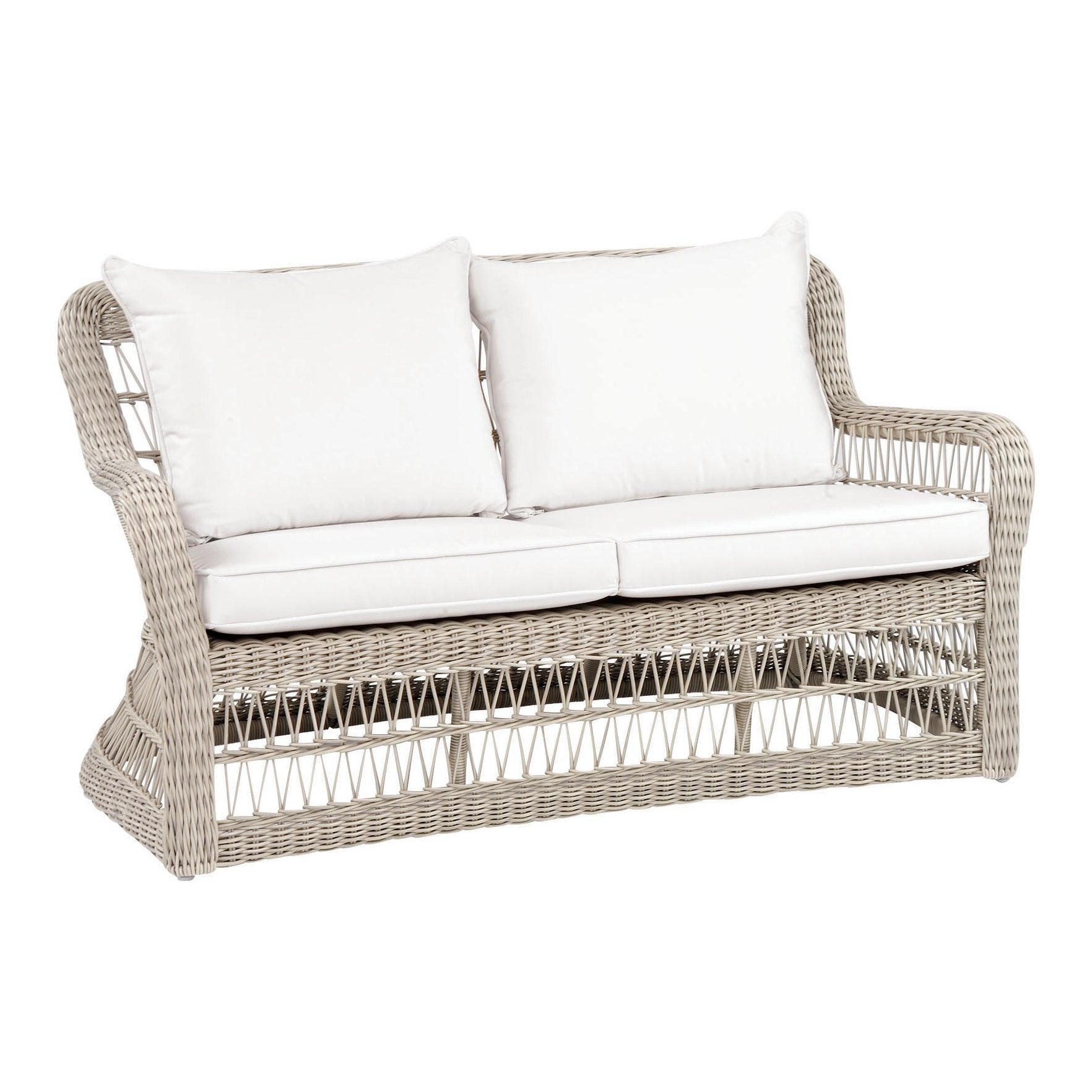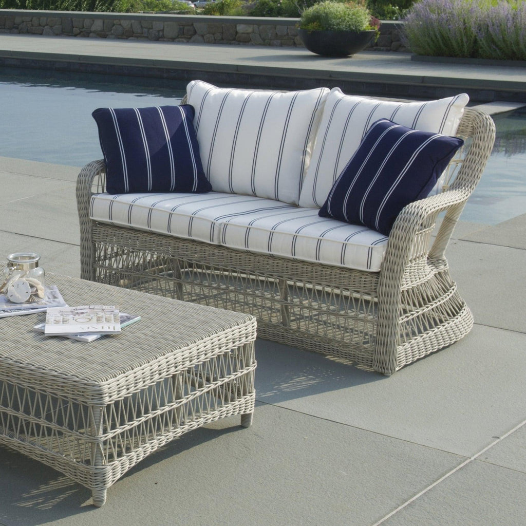 The Southampton deep-seating sofa is an updated version of the classic, open-weave wicker furniture. The sofa is hand woven using extra large wicker fiber, making it heavier and more substantial than typical outdoor wicker furniture.