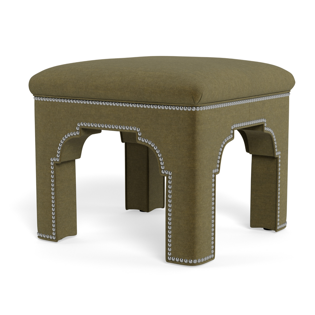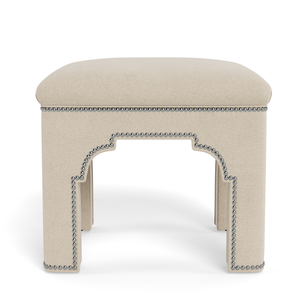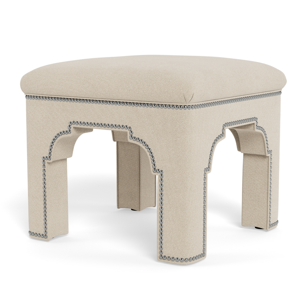 Add a chic accent to any room with this compact Bunny Williams Home ottoman on its own or displayed in pairs. The tightly upholstered seat covers a solid maple frame. A Mughal-inspired arch and French nailhead trim make it a standout in style. Click on images for greater detail.