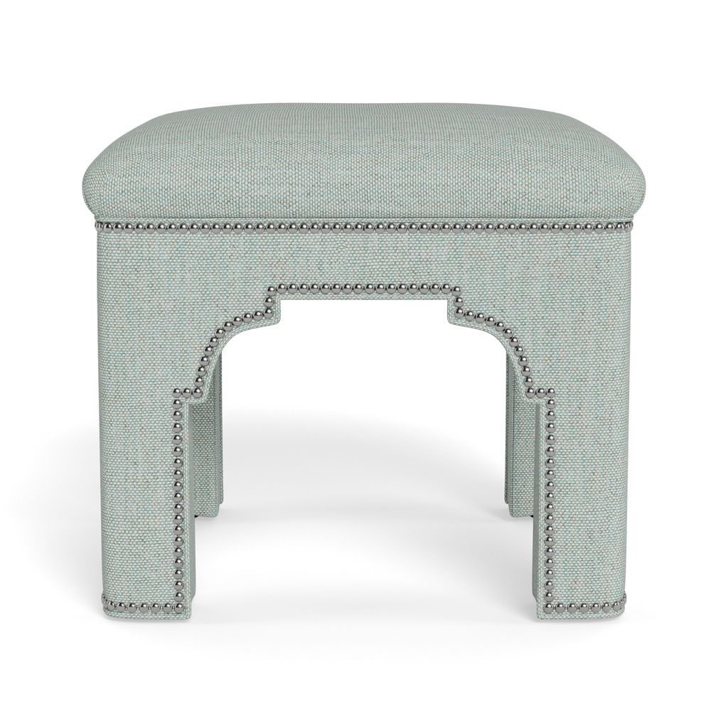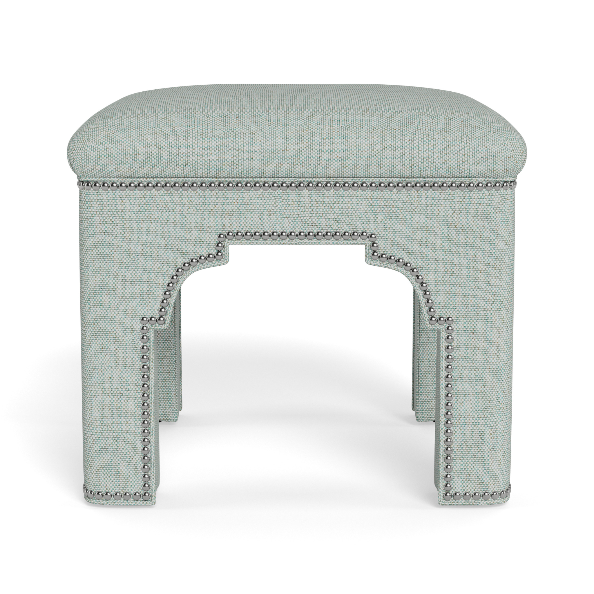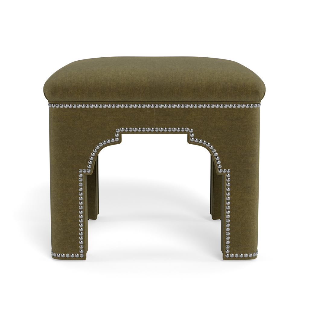 Add a chic accent to any room with this compact Bunny Williams Home ottoman on its own or displayed in pairs. The tightly upholstered seat covers a solid maple frame. A Mughal-inspired arch and French nailhead trim make it a standout in style. Click on images for greater detail.