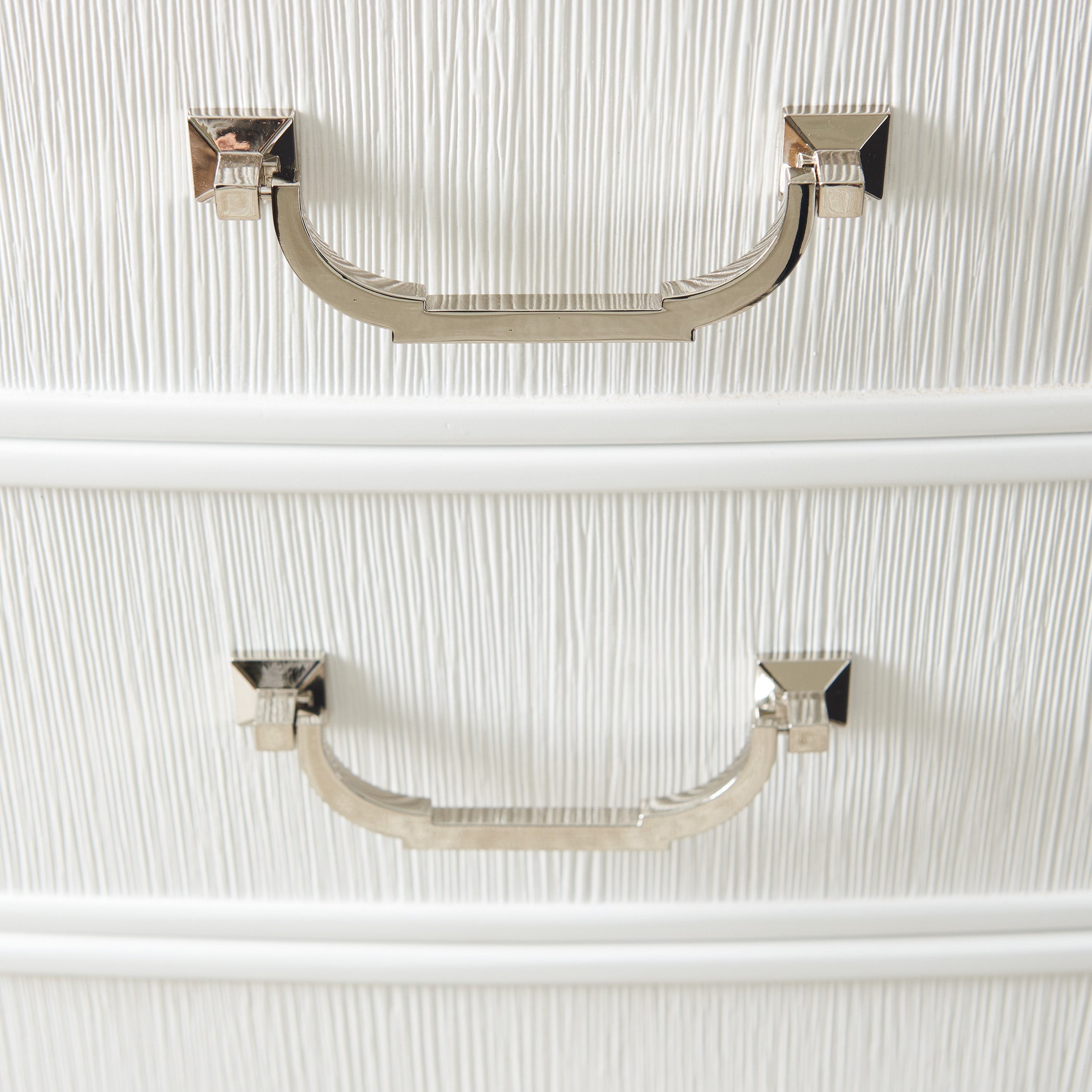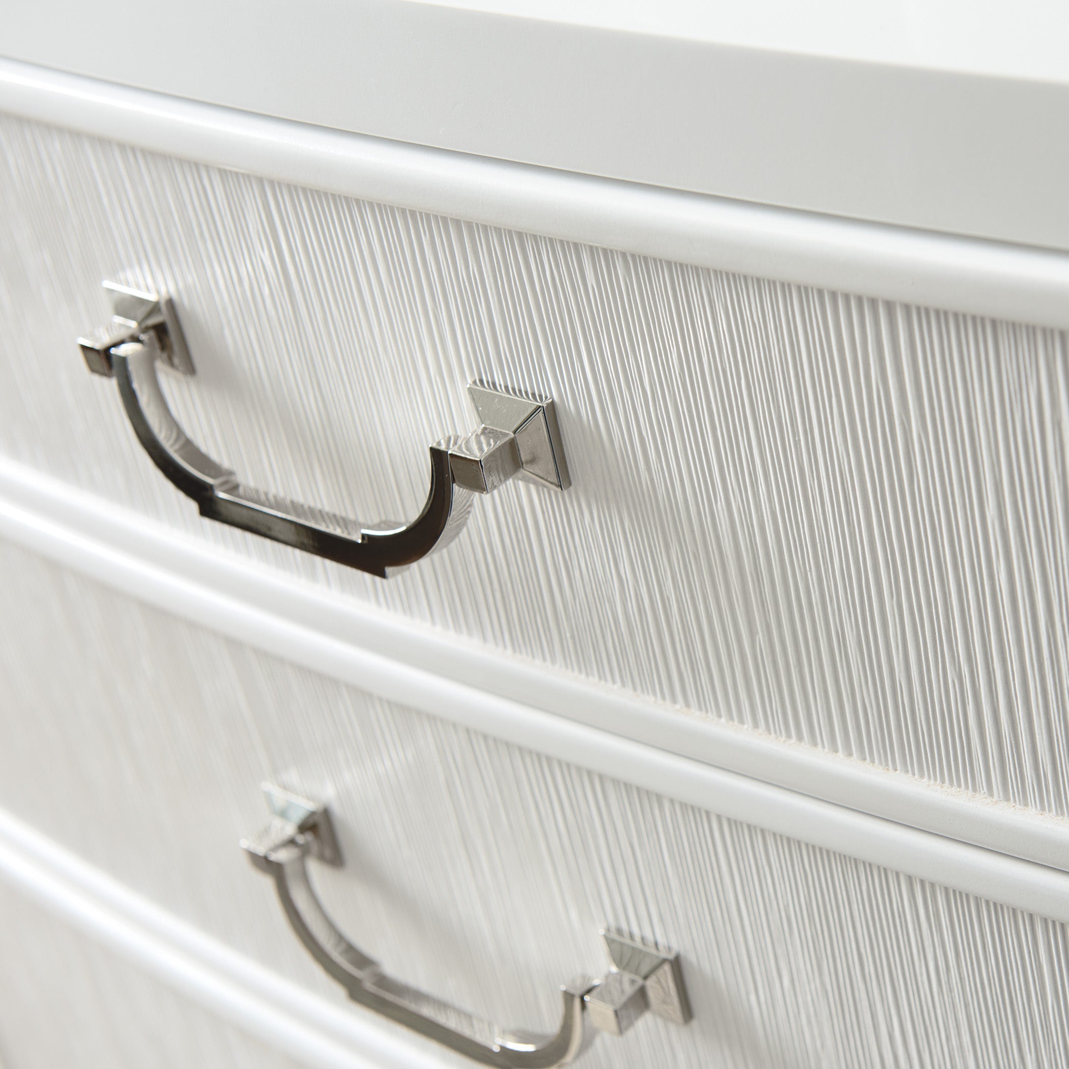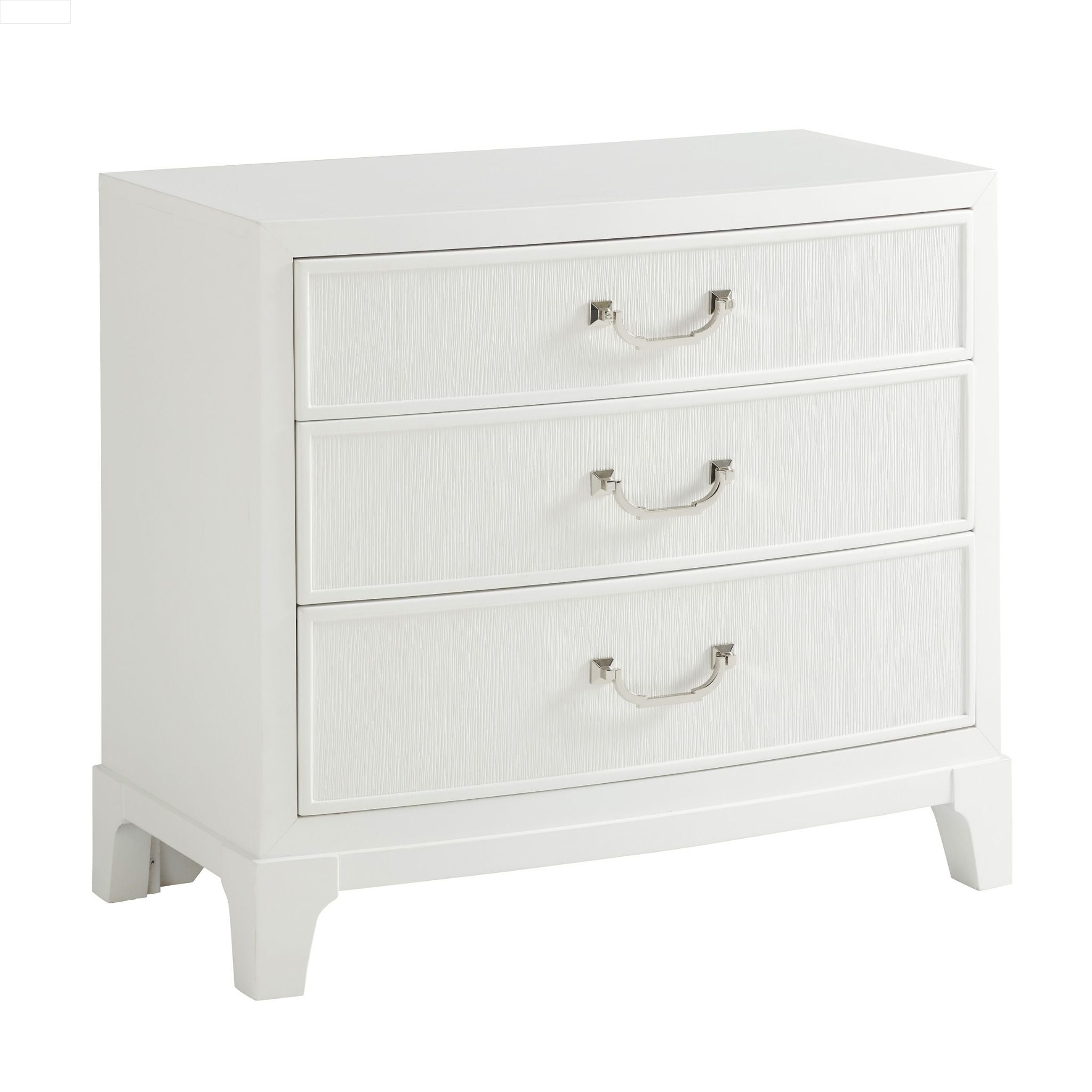 Add timeless sophistication and function to your bedroom with the Lexington Avondale Tamera Nightstand. Featuring a graceful bowfront silhouette, this elegant 3-drawer nightstand offers generous bedside storage with soft-touch self-closing drawers adorned in textured veneer. The polished nickel custom hardware adds a touch of refined glamour, perfectly complementing the crisp Alabaster white finish.