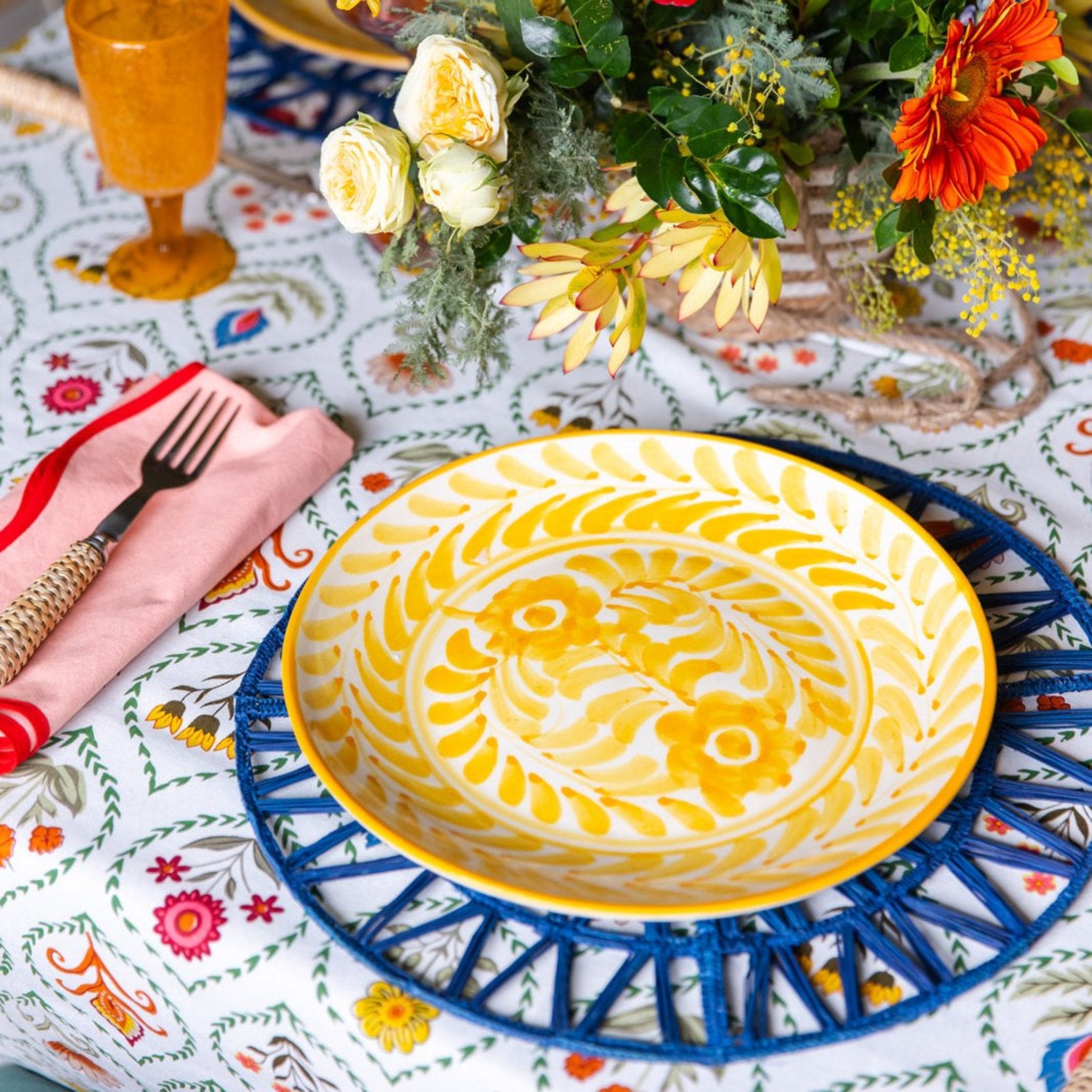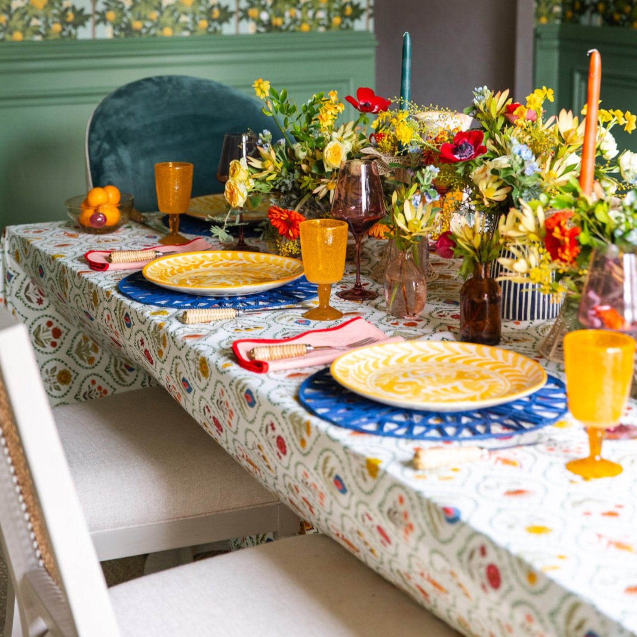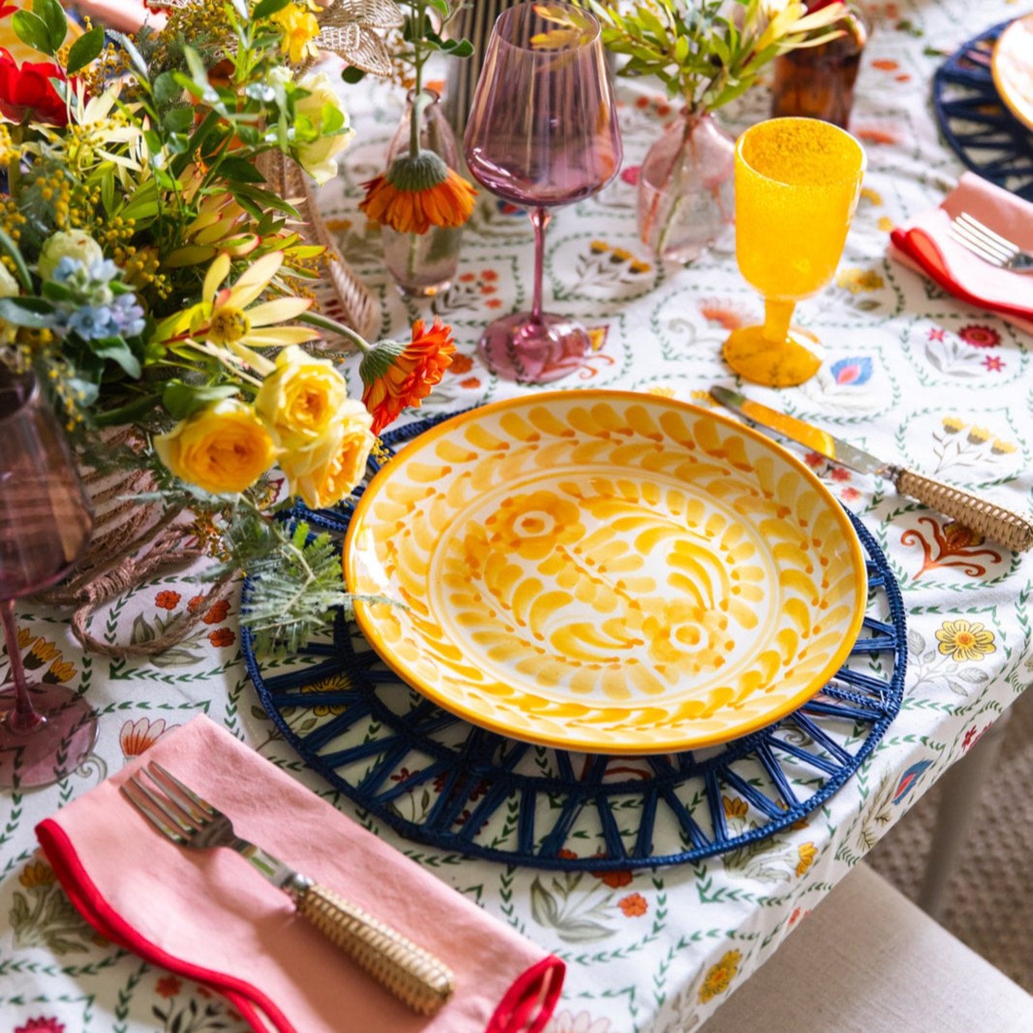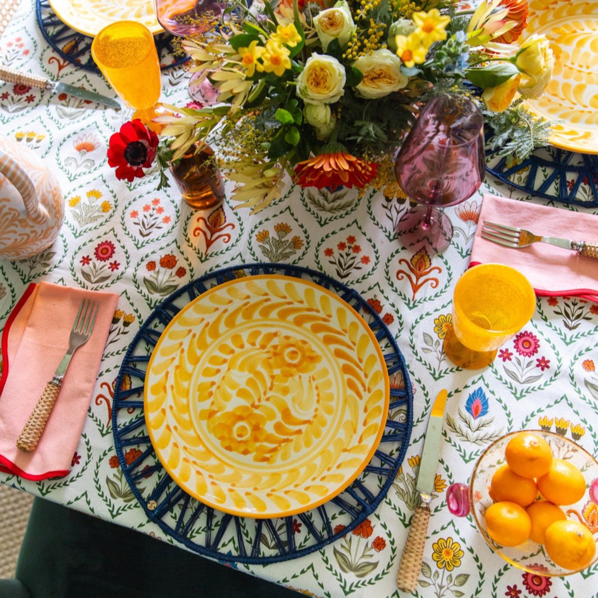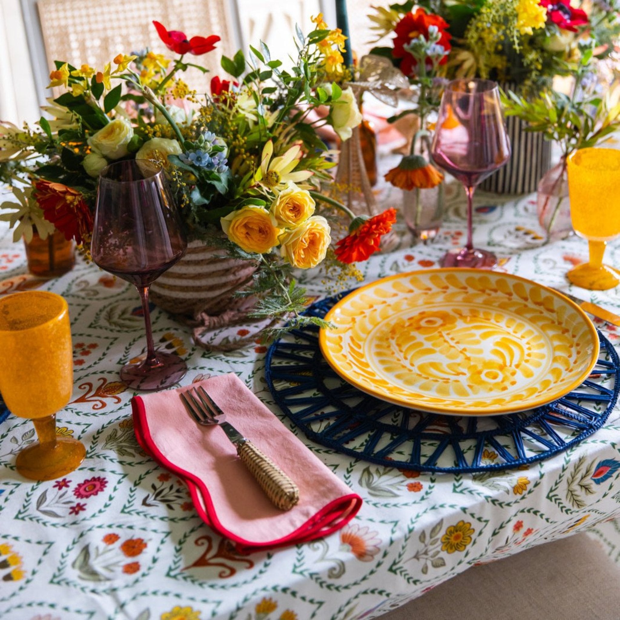 Add a touch of whimsy to your table settings with this fabulous floral tablecloth, perfect for any season. Matching napkins available.