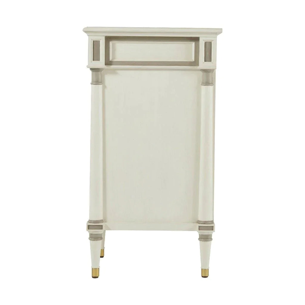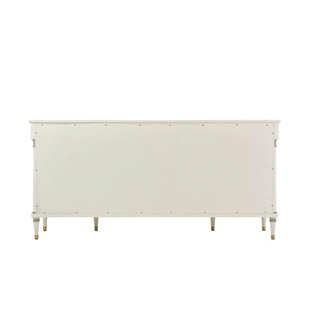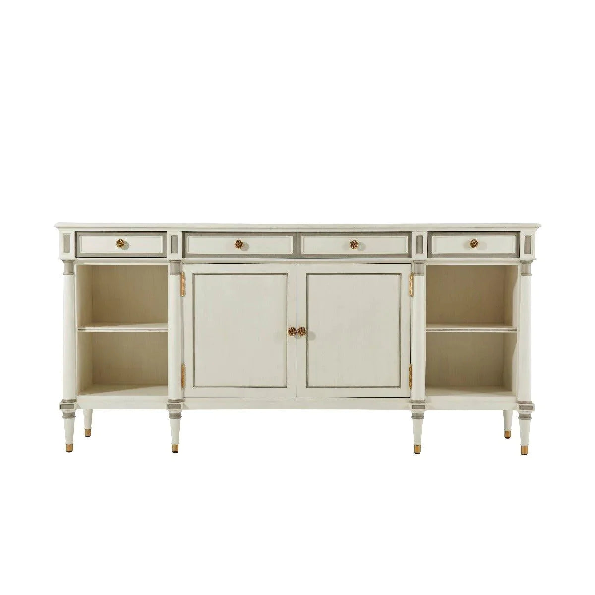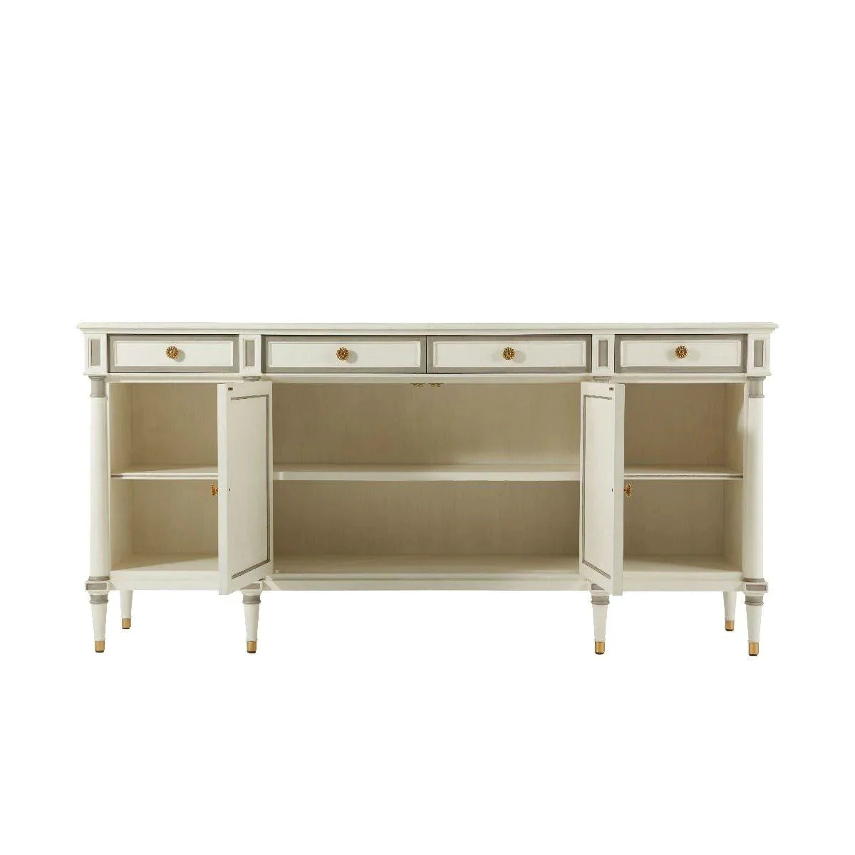 This piece puts a modern spin on the traditional buffet cabinet. There is storage aplenty with four frieze drawers, two center doors opening to interior shelves, plus open storage on buffet sides. Doric pilasters flow into turned, tapered legs capped in brass.