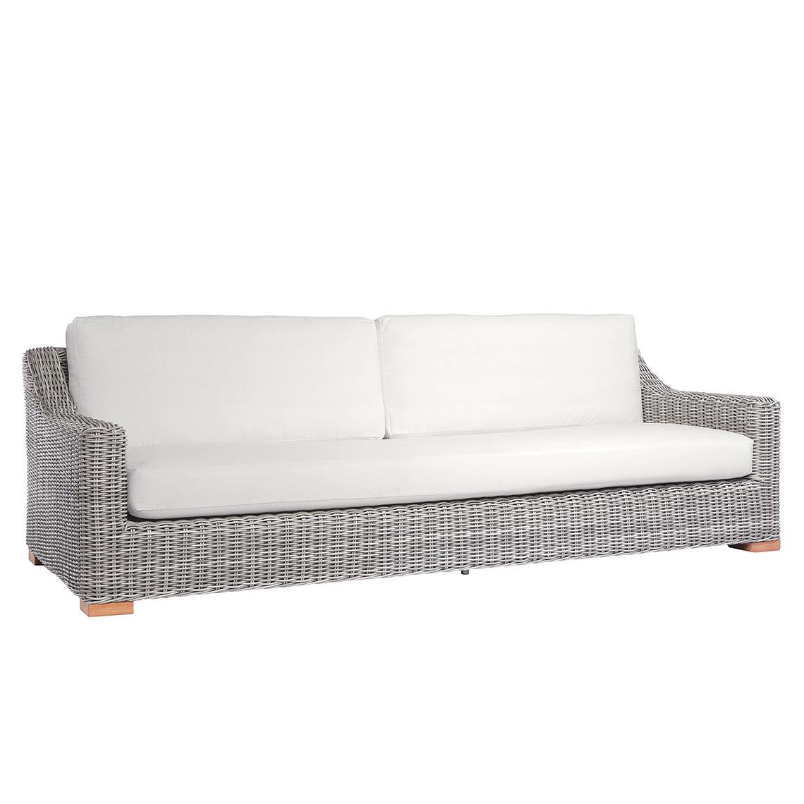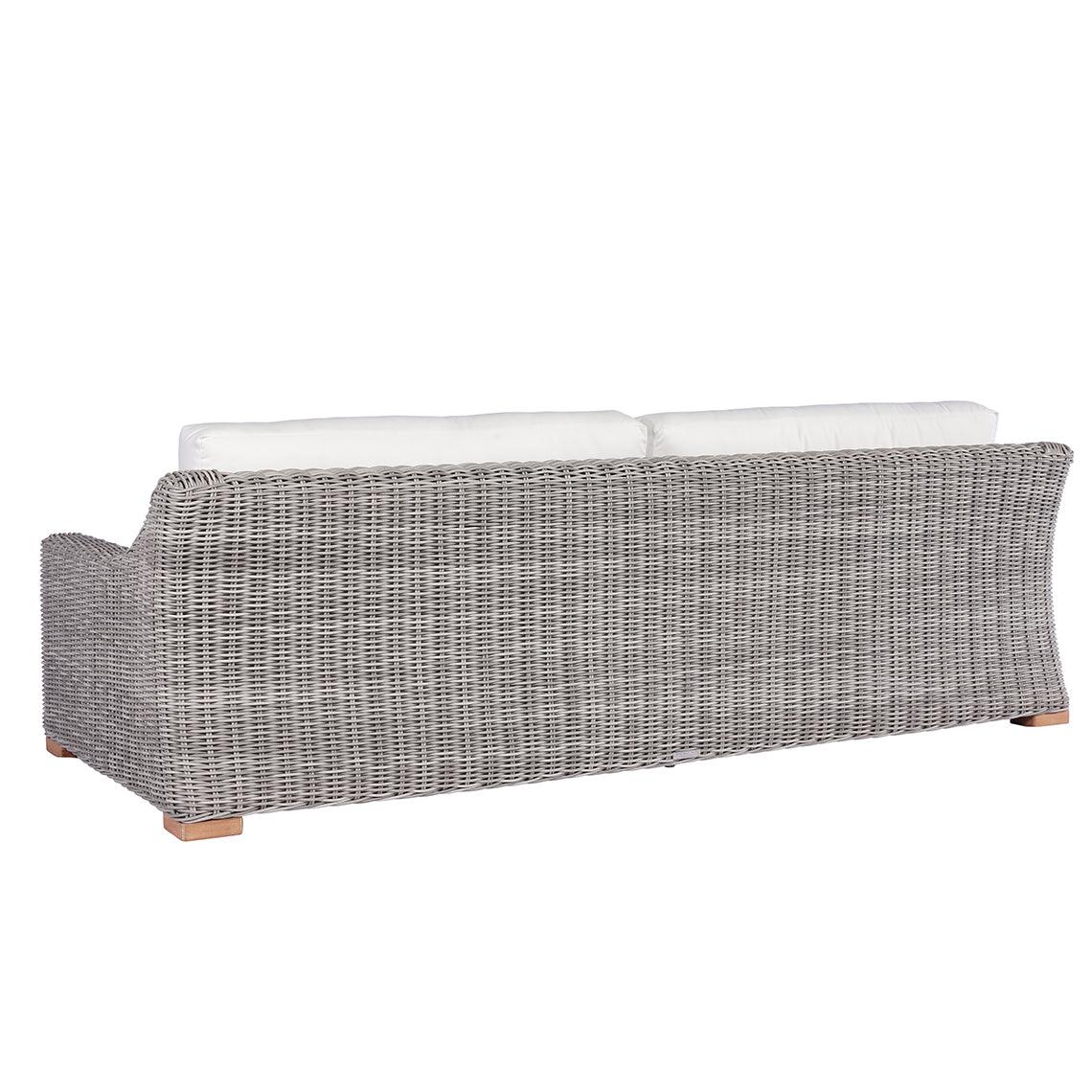The wide expanses and uninterrupted lines of the Tortola accentuate its grand proportions. Elegant sloping arms, extra-deep cushions, and handwoven wicker in soft gray tones provide all the necessary elements for a relaxing, inviting, lounge setting. Frames are crafted from rustproof aluminum wrapped with premium all-weather wicker; feet are made from Grade A teak.