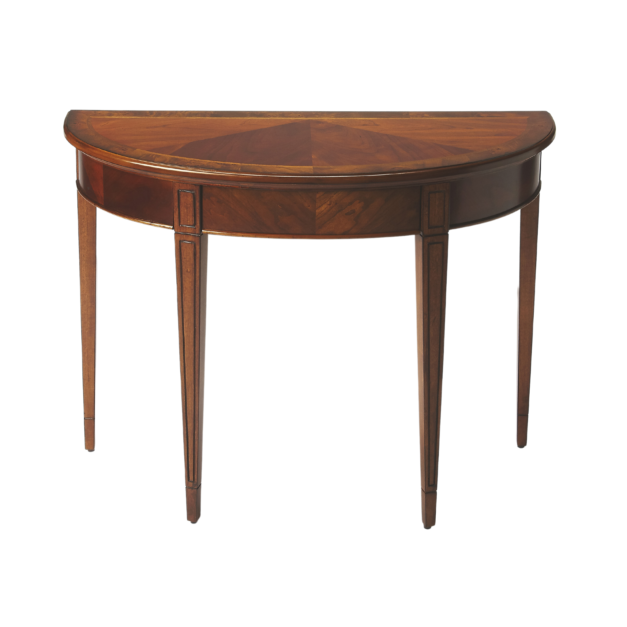 With simple lines, traditional styling, and a demilune shape, this elegant console table will enhance your space for years to come. This piece is crafted from select solid woods and choice veneers, and features an olive ash burl finish and a beautiful cherry veneer top with a maple veneer inset border. The front apron and tapered legs are adorned with lovely carved details. It is the perfect addition to the living room, hall, or entryway.