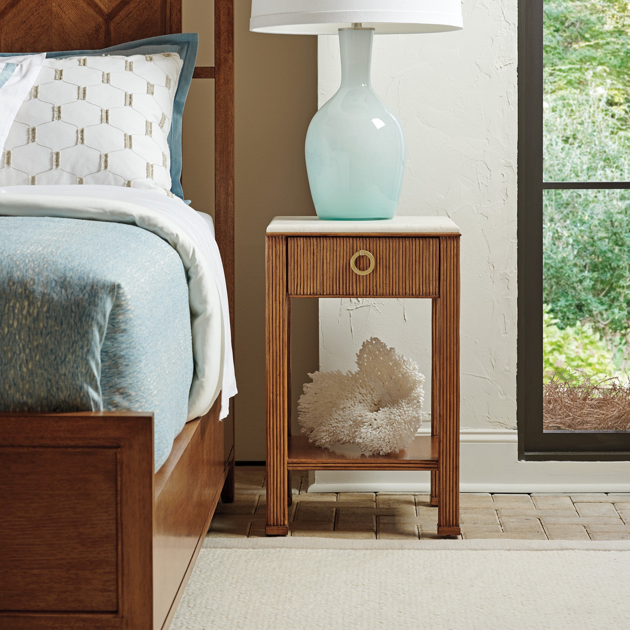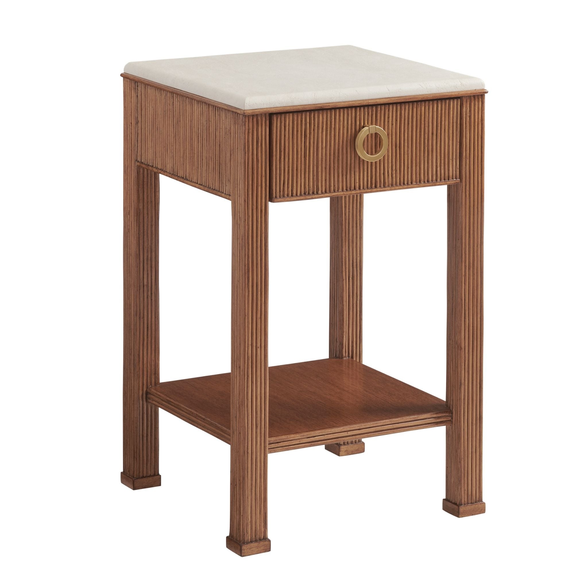 Elevate your bedroom or living space with the Tristan Night Table by Tommy Bahama Home, part of the Palm Desert collection. This 18-inch nightstand features an applied pencil rattan detail, Anticato marble top, storage drawer and finished back.