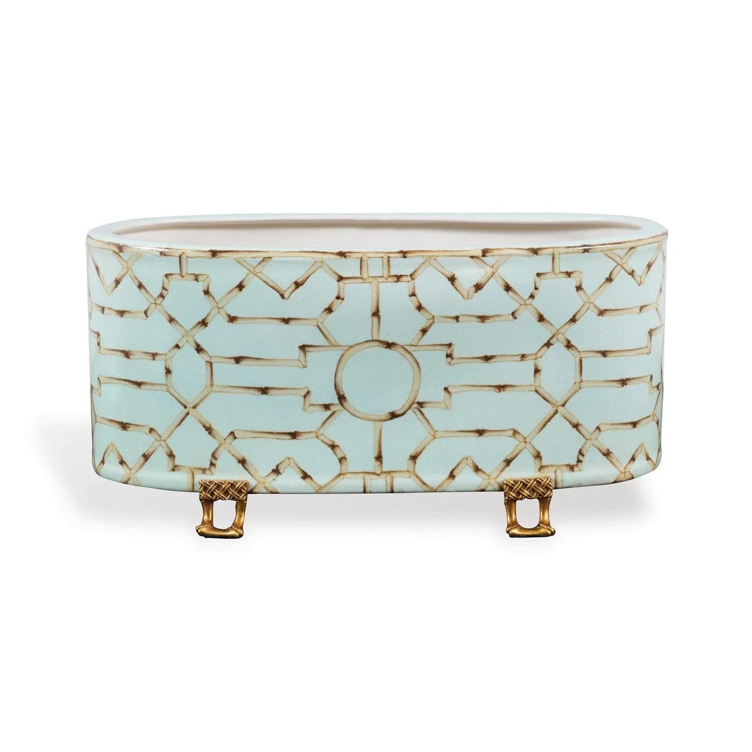 This lovely turquoise and brass accented planter is perfect for so many uses--for example add ice and chilled wine, flowers, or even rolled hand towels. This planter measures 8.5" H x 18" W x 8" D and is made of porcelain and brass.