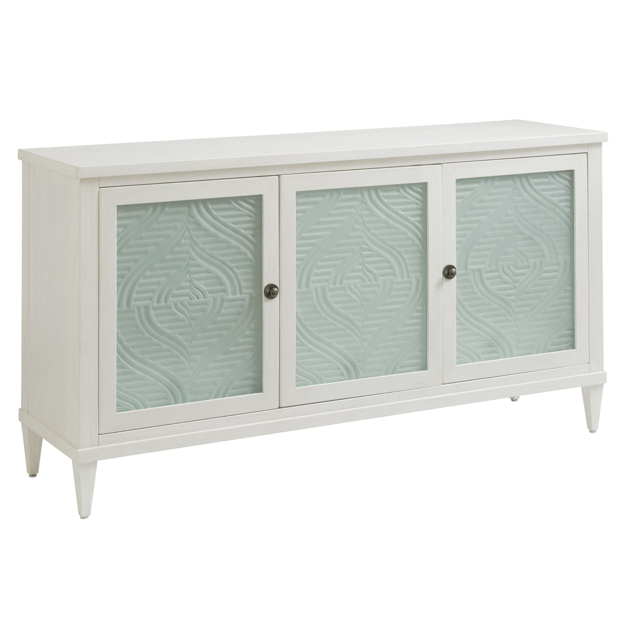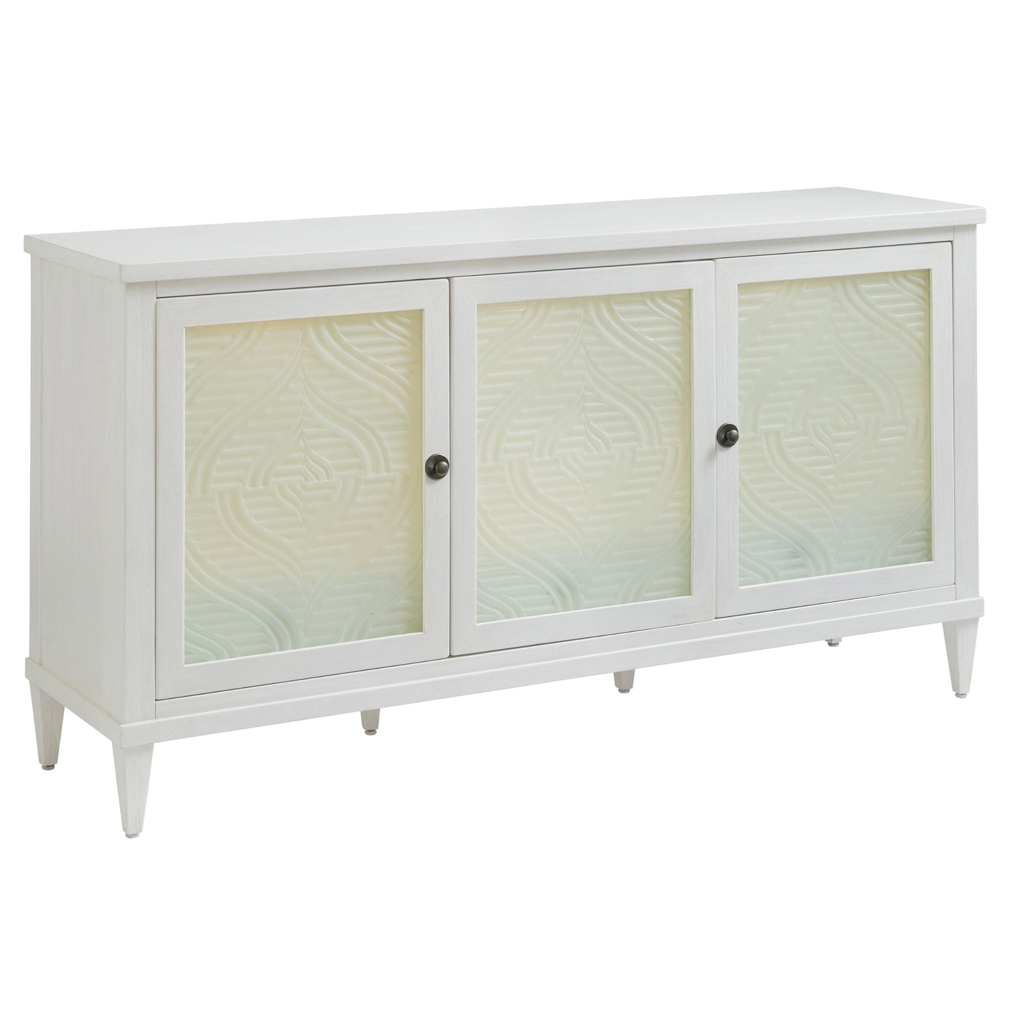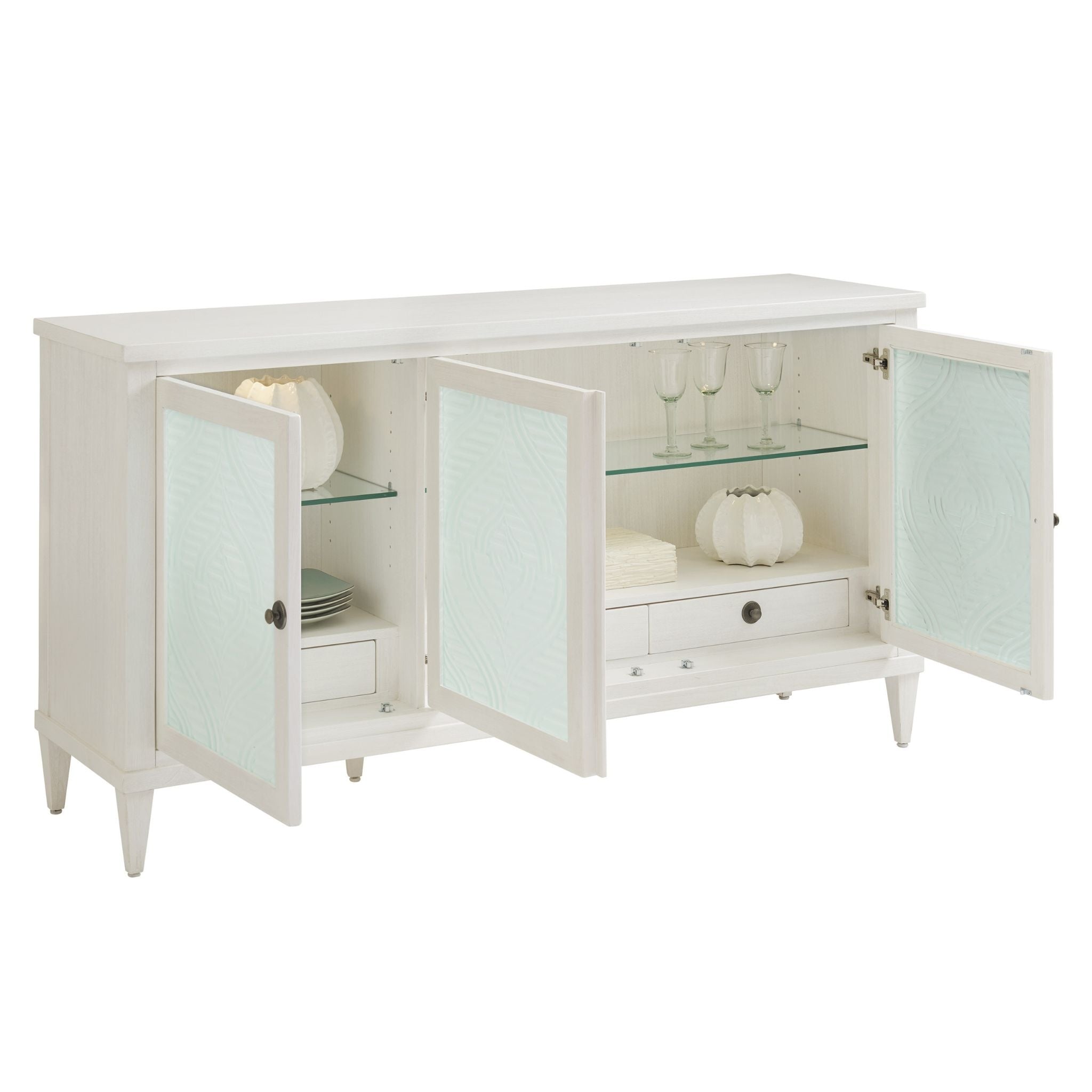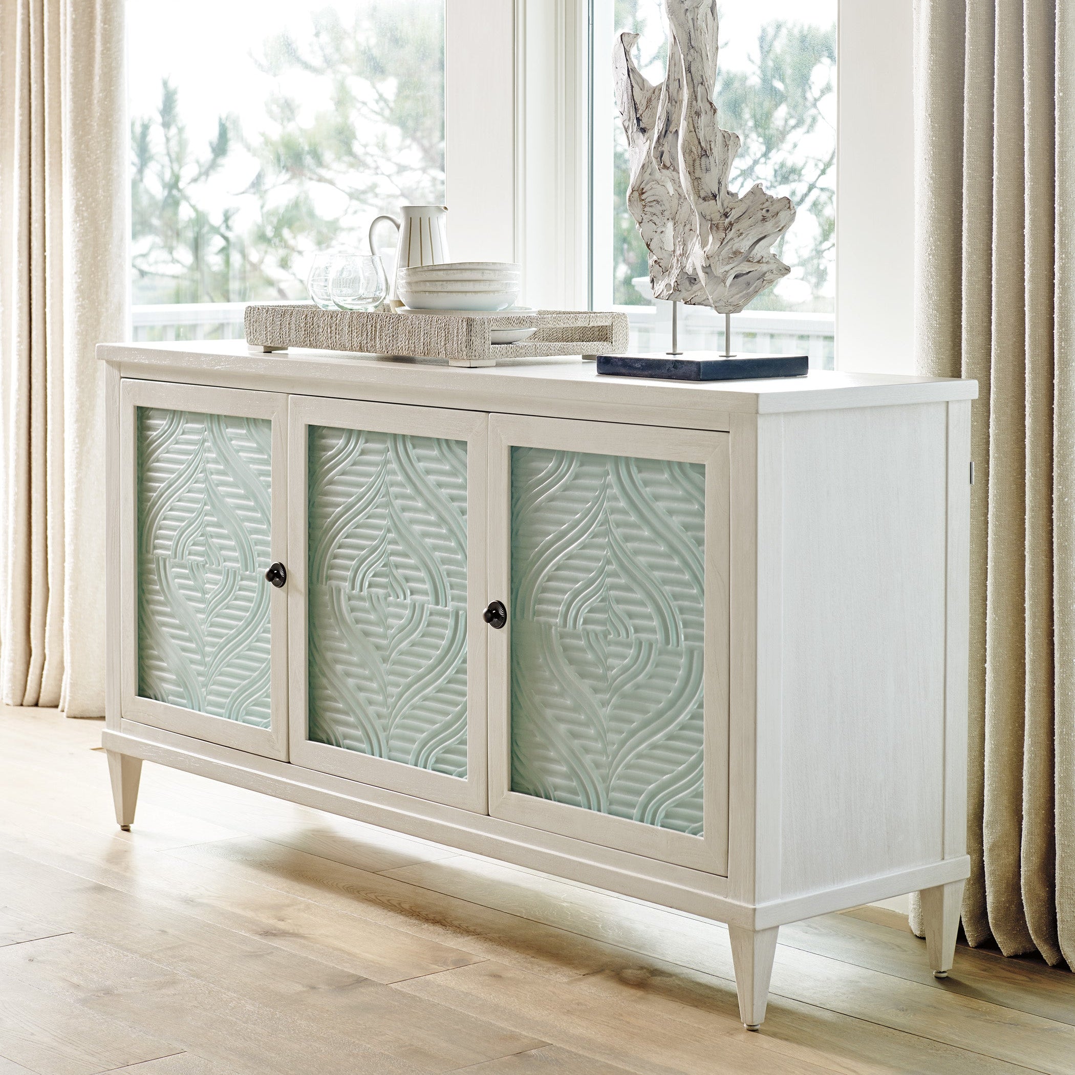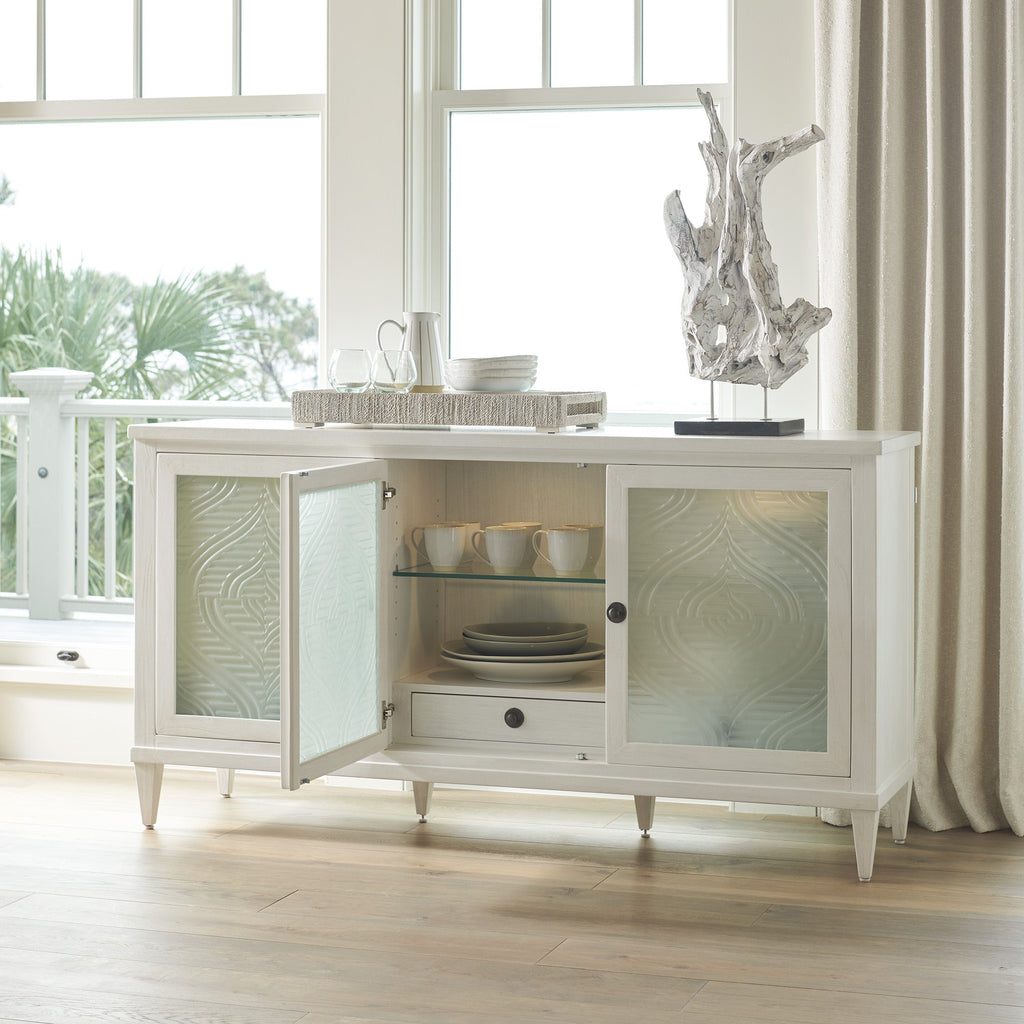 The Turtle Point Buffet from the Ocean Breeze Collection by Tommy Bahama Home features sandblasted sea glass door panels with a vertical wave design, evoking a serene, beachside aesthetic. Inside, adjustable glass shelves, three felt-lined drawers, and a silverware divider offer versatile storage, while dimmable LED lighting adds a soft, ambient glow.