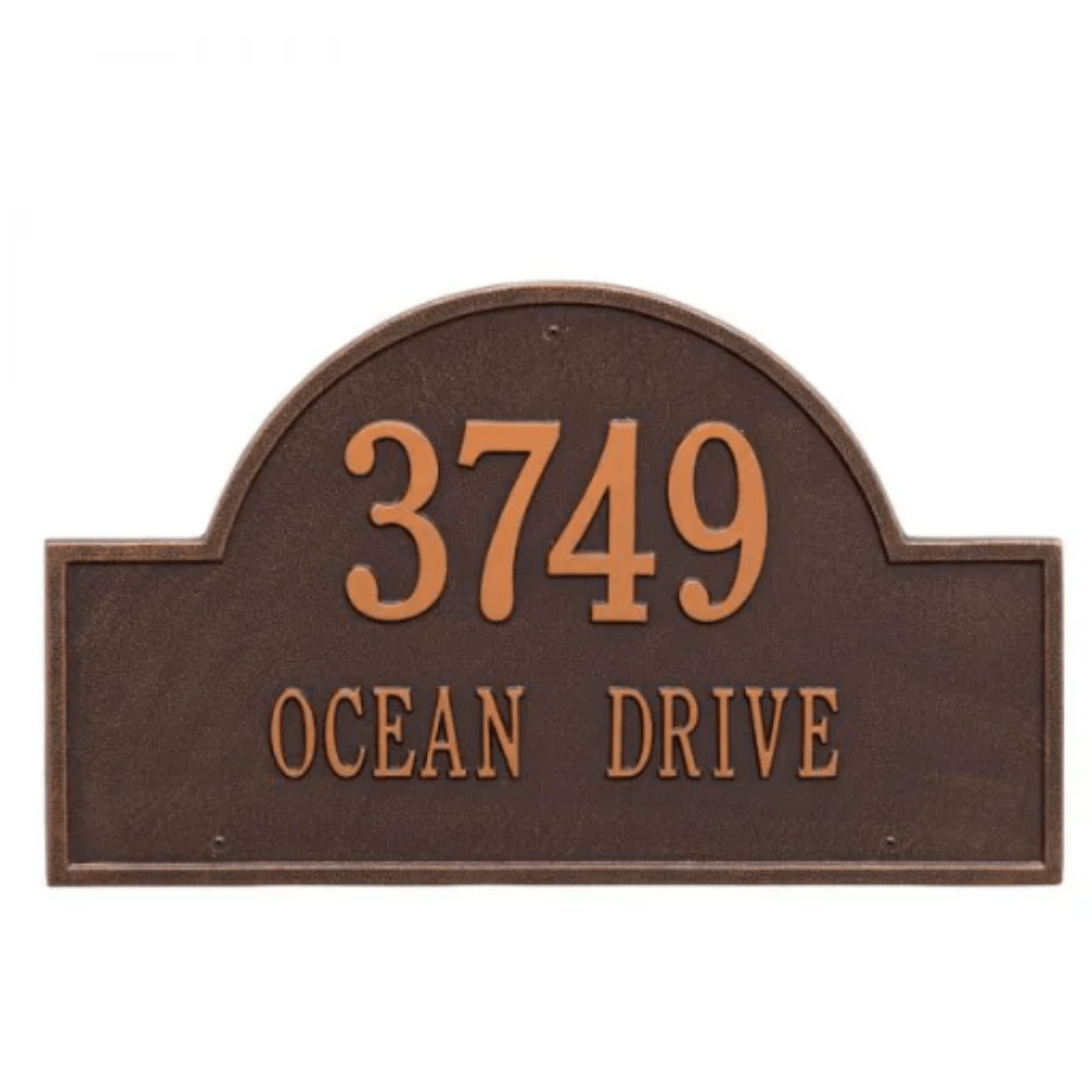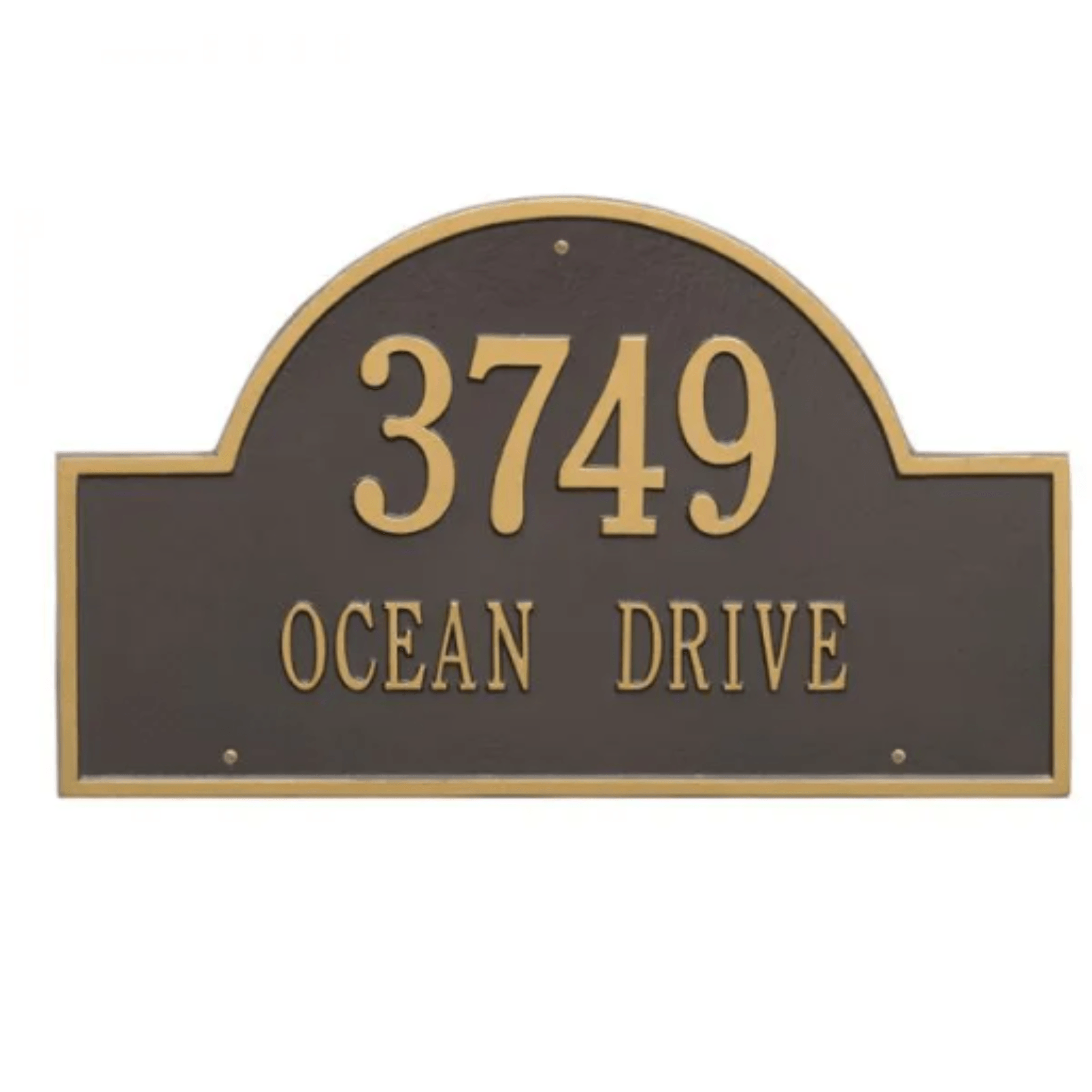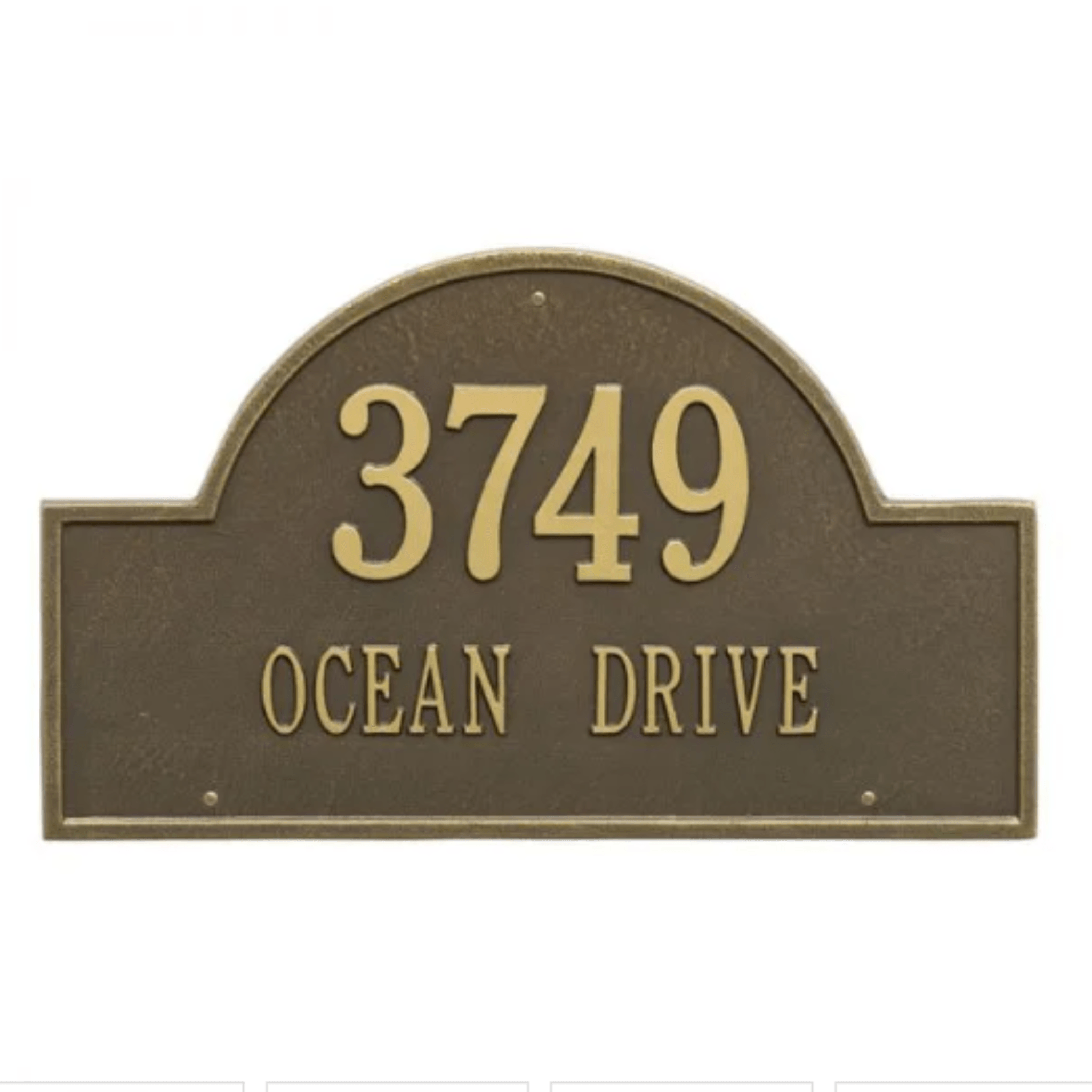 The Whitehall Products Arch Marker Address Plaque will accentuate your home’s exterior with elegance. The address plaque is made from rust-free cast aluminum providing excellent quality. The plaque has a stylish arch shape. Made in the USA. It measures 23.75” x 14” x 0.375” and weighs 6.326lbs. Made of aluminum. Line 1: 5 - 4.5 numbers. Line 2: 17 - 2 characters. Horizontal orientation. Please note, this item is custom made to order and is not eligible for return. Please enter your personalization exactly as you would like for it to appear below. Ships via FedEx. Click on image for greater detail.