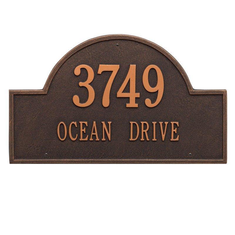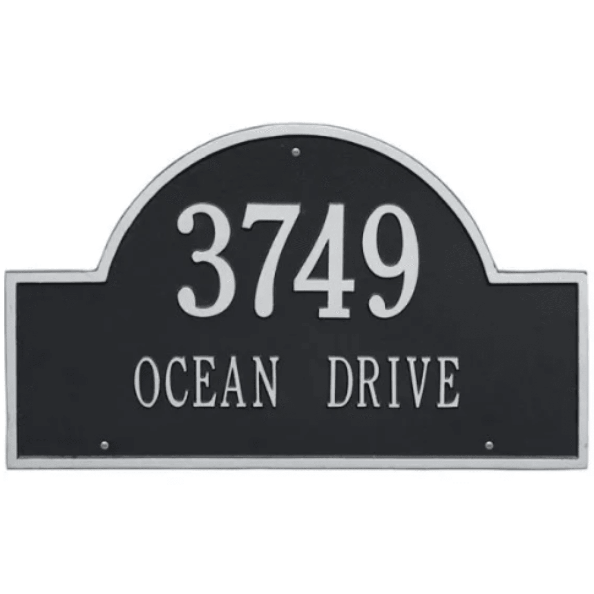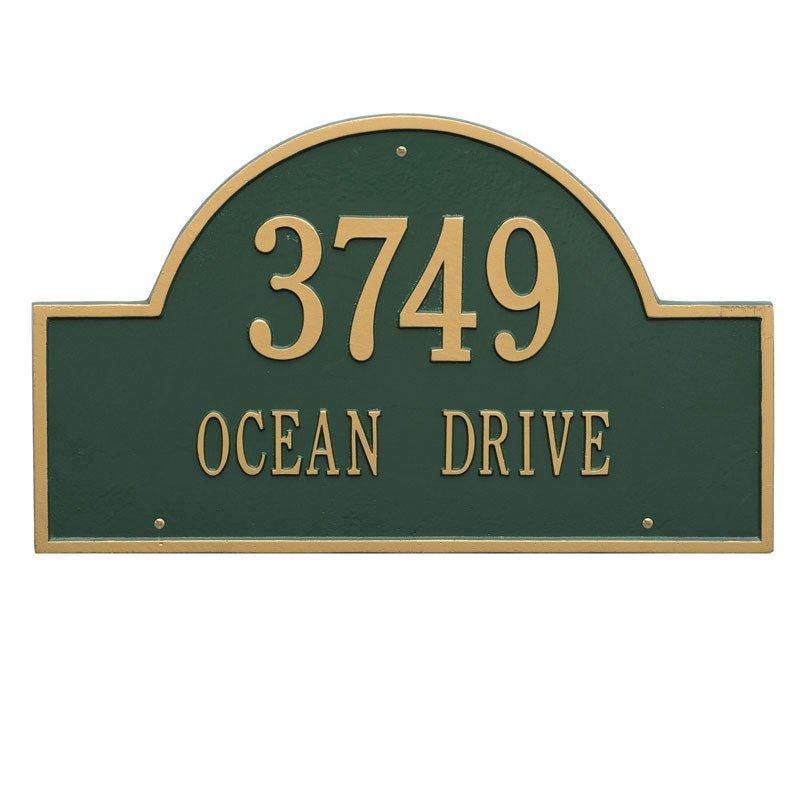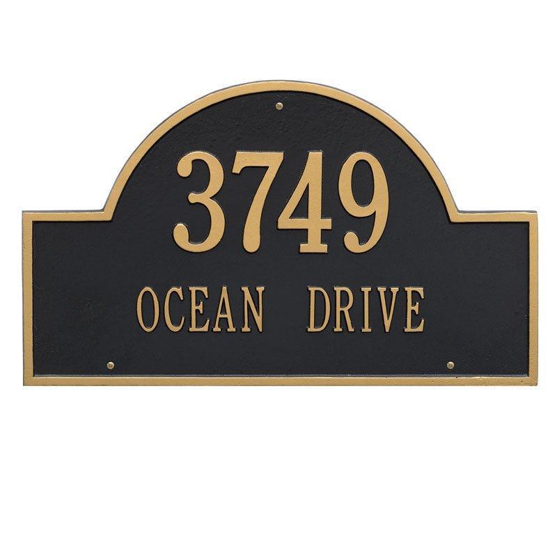 The Whitehall Products Arch Marker Address Plaque will accentuate your home’s exterior with elegance. The address plaque is made from rust-free cast aluminum providing excellent quality. The plaque has a stylish arch shape. Made in the USA. It measures 23.75” x 14” x 0.375” and weighs 6.326lbs. Made of aluminum. Line 1: 5 - 4.5 numbers. Line 2: 17 - 2 characters. Horizontal orientation. Please note, this item is custom made to order and is not eligible for return. Please enter your personalization exactly as you would like for it to appear below. Ships via FedEx. Click on image for greater detail.