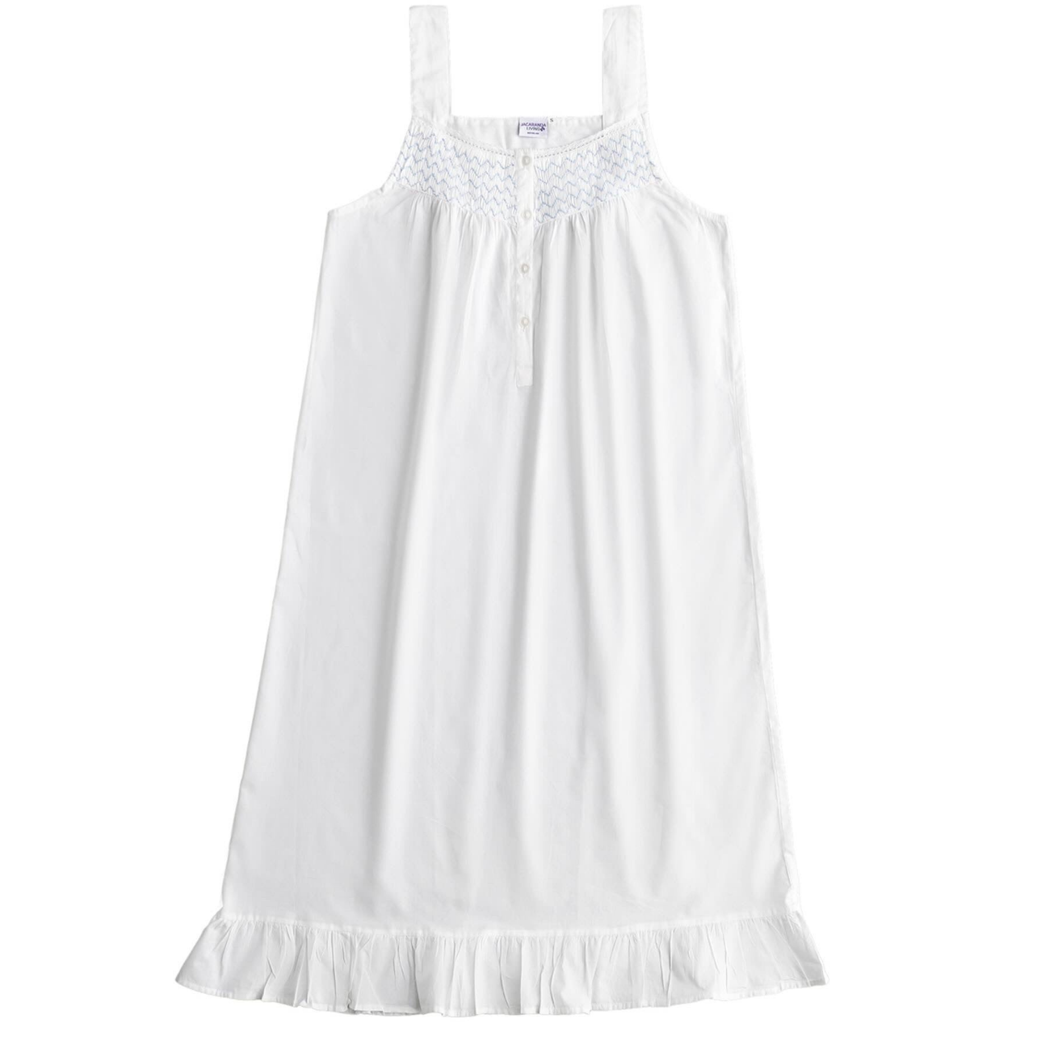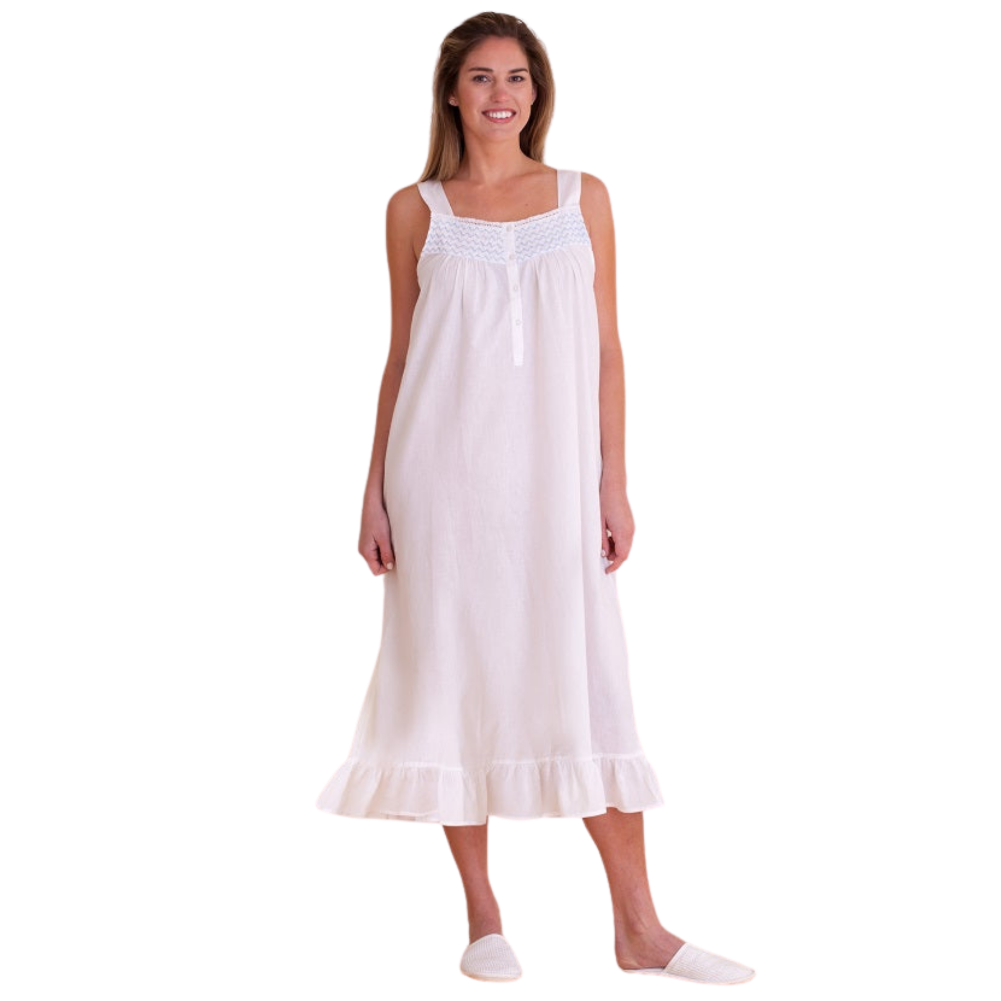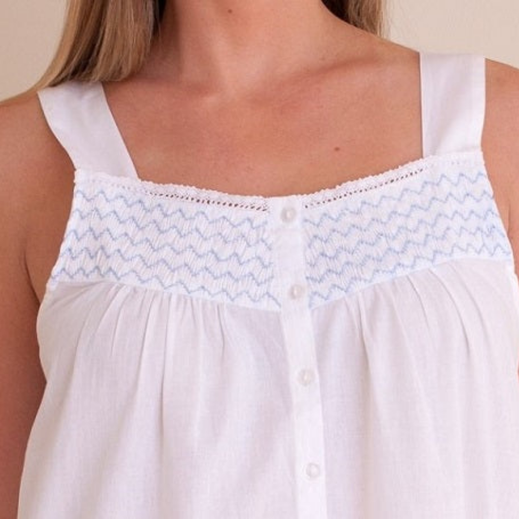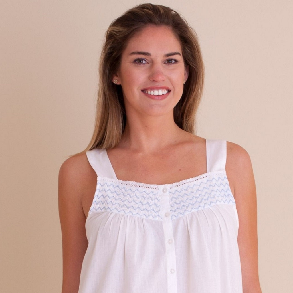 Made with crisp 100% cotton, the sleeveless Vicki nightgown is a favorite for evenings at home. Effortless luxury for laid-back lounging, this nightgown features beautiful blue smocking on the bodice, a ruffled hem and four buttons down the front. Also great for pregnancy and breastfeeding mothers!