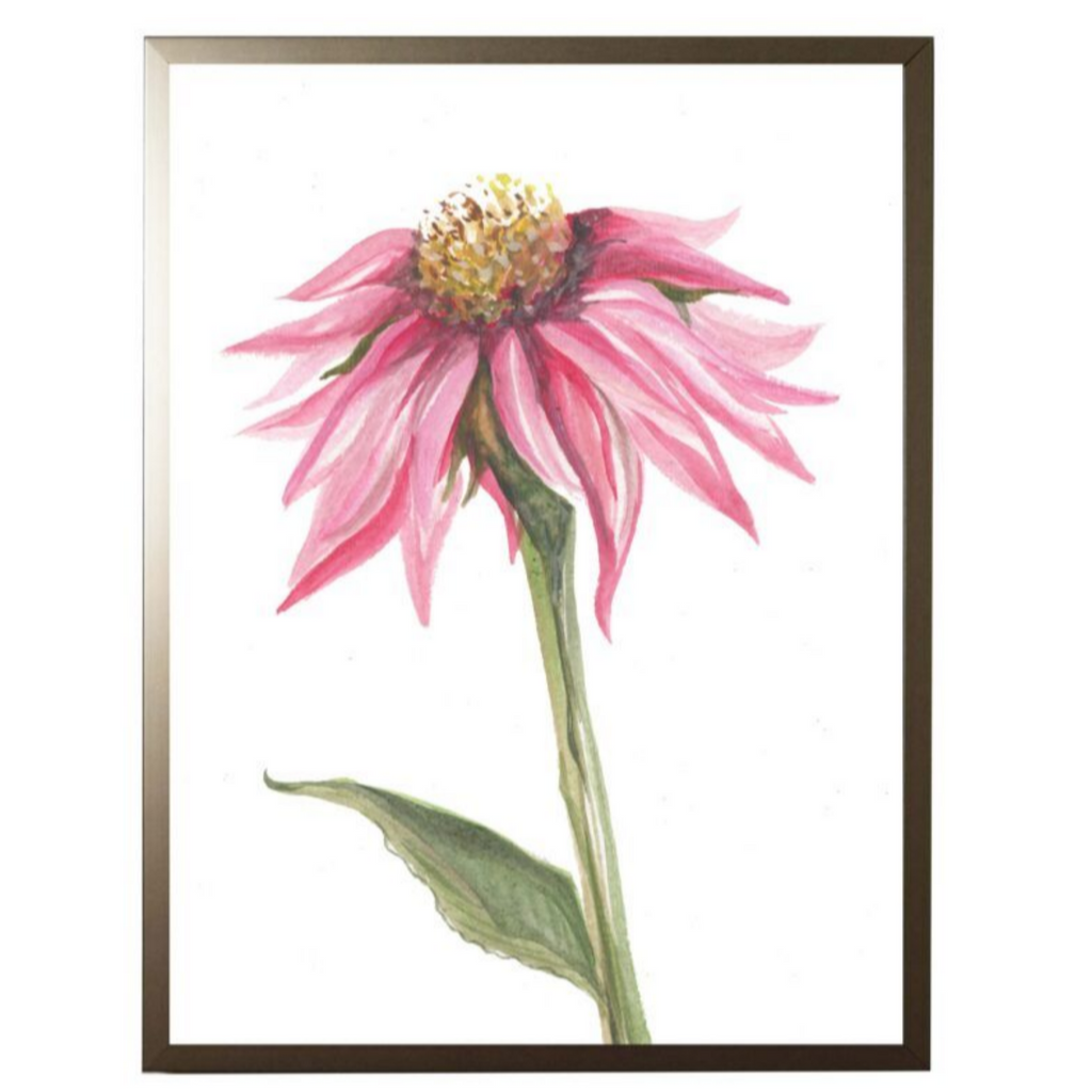 This framed wall art features a watercolor pink coneflower. This piece works in traditional and modern interiors alike.