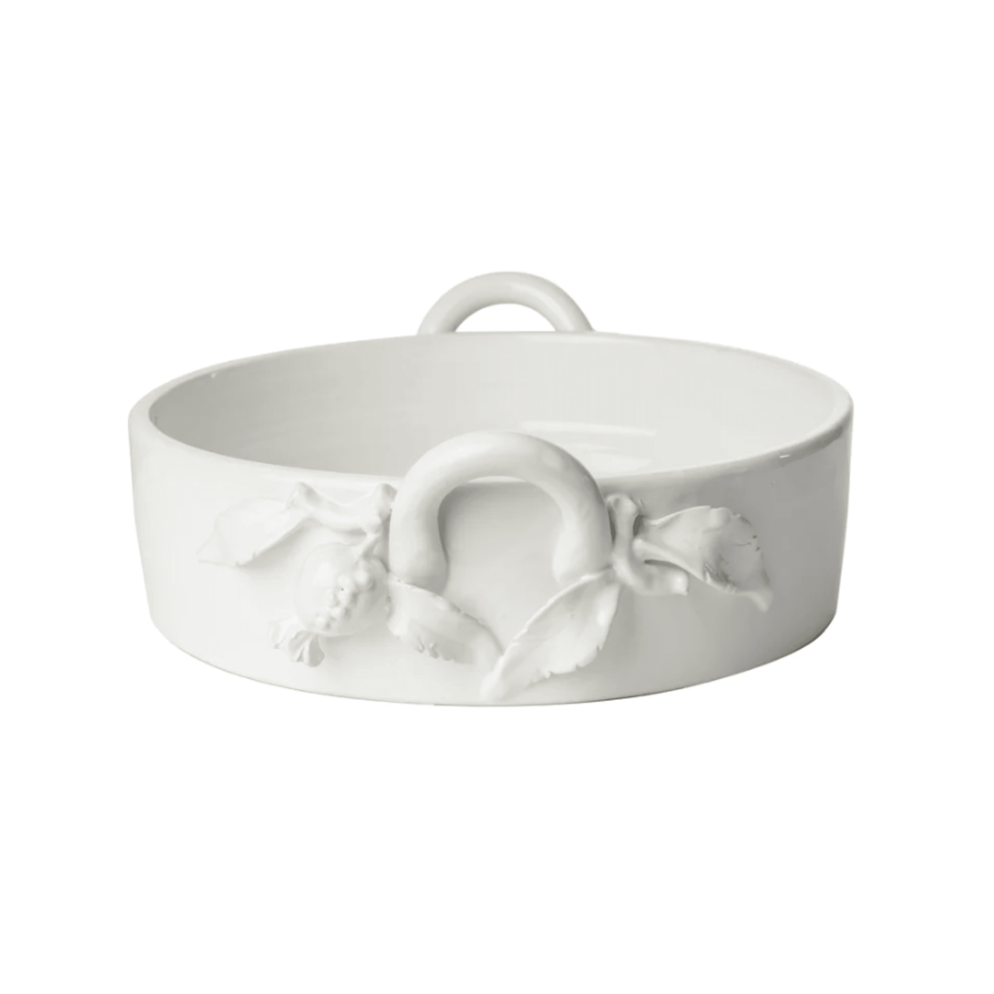 This shiny glazed snow white bowl makes a spectacular centerpiece. Perfect in traditional or modern settings. The pomegranates are the perfect hand-crafted accent on this bowl.  Click images for greater detail.