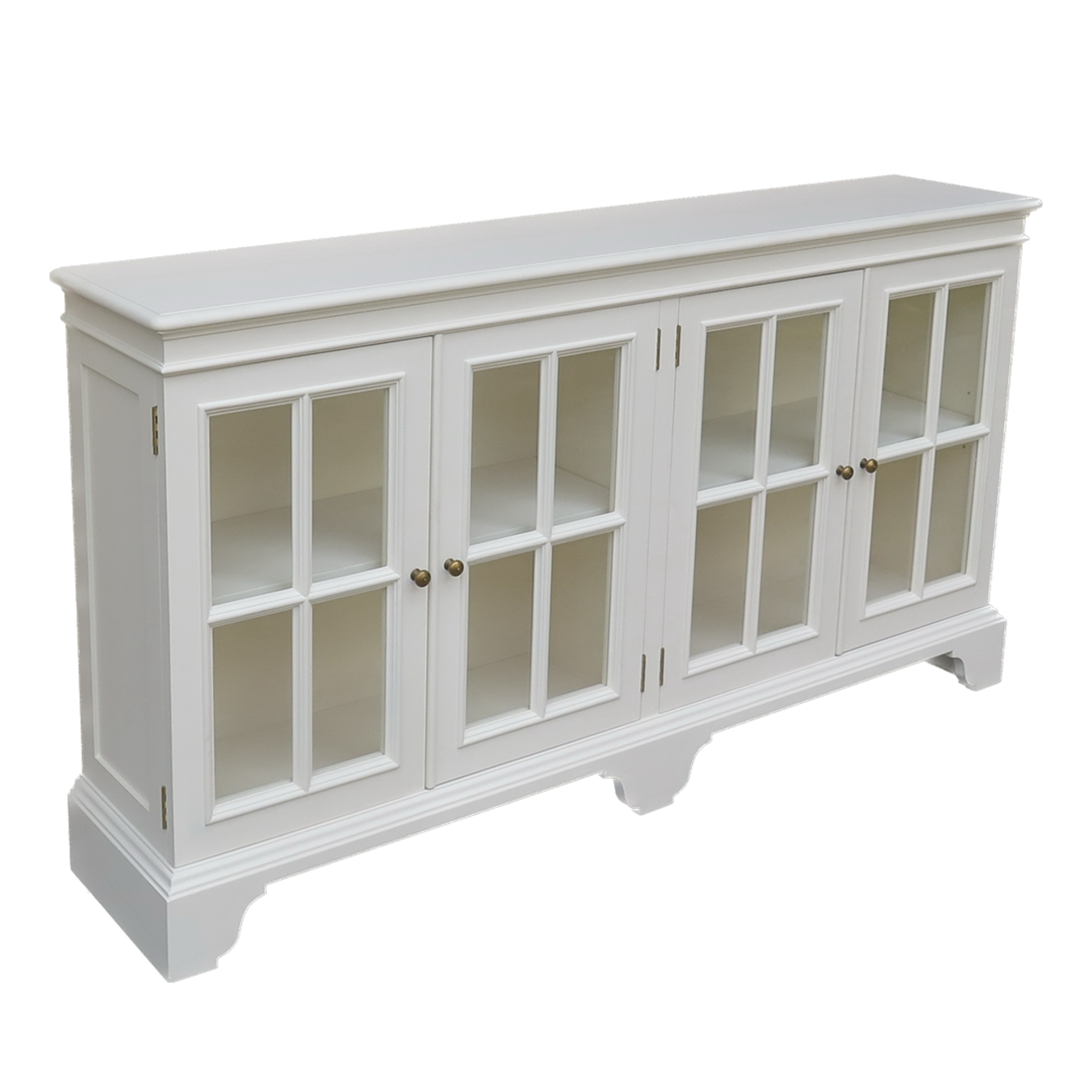 A terrific storage cabinet with a molded top over four framed glass doors resting on an open bracket base. One adjustable shelf inside each half of the bookcase. Click images for greater detail.