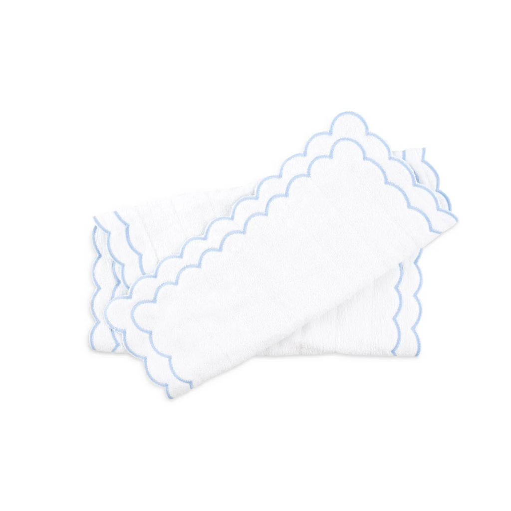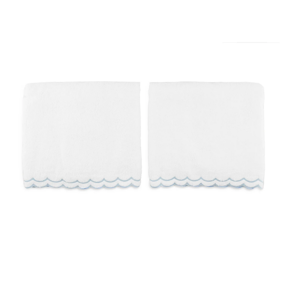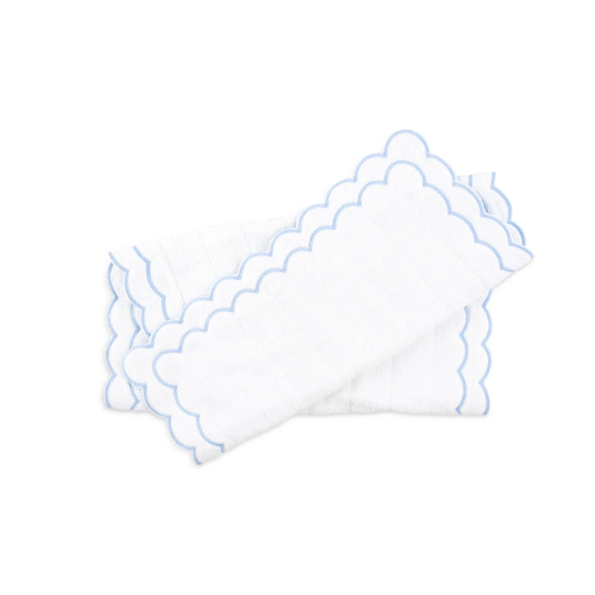 Elevate your bathroom with this luxurious floor mat. You'll love this thick, double sided bath mat finished with double scallop cotton embroidery. Sold individually. Available with light blue, pink, or green trim. This item is final sale and is not eligible for return. Click images for greater detail.