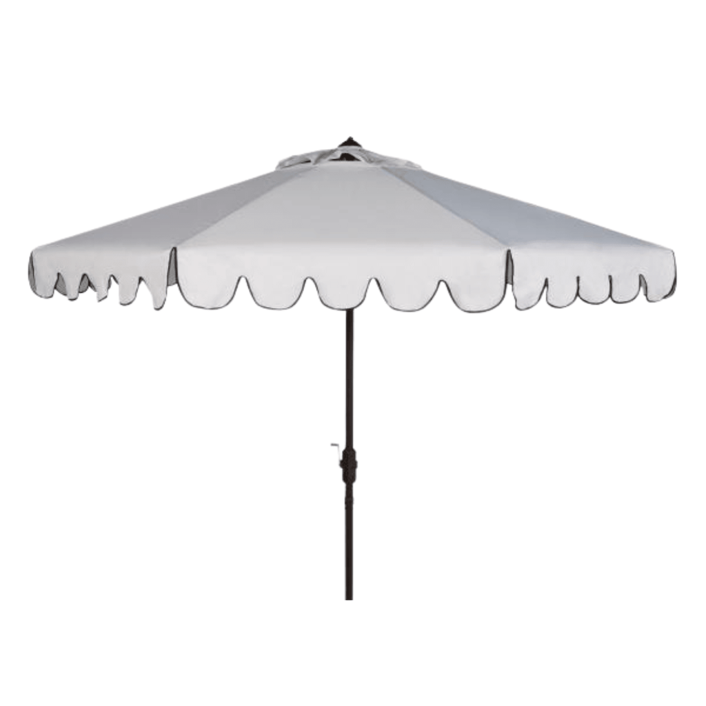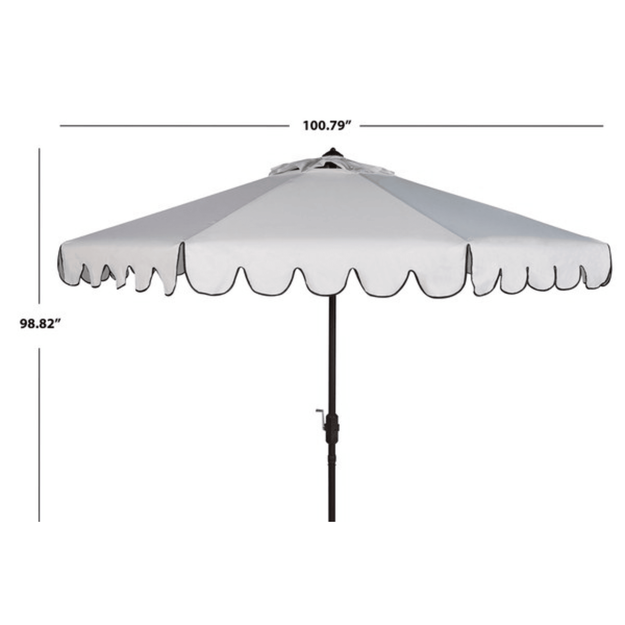 The signature white and blue coloration of Santorini‚Äôs lush legendary resort-inspired this nine-foot crank umbrella. Its sophisticated white hue features a single scallop black trim to create an outdoor retreat for the modern tastemaker. When open this umbrella measures 100.79"W X 100.79"D X 98.82"H. and when closed it measures 6.1"W x 6.1"D x 98.82”H. Click on images for greater detail.