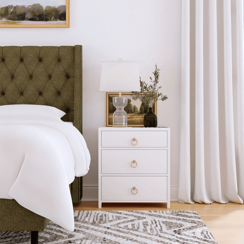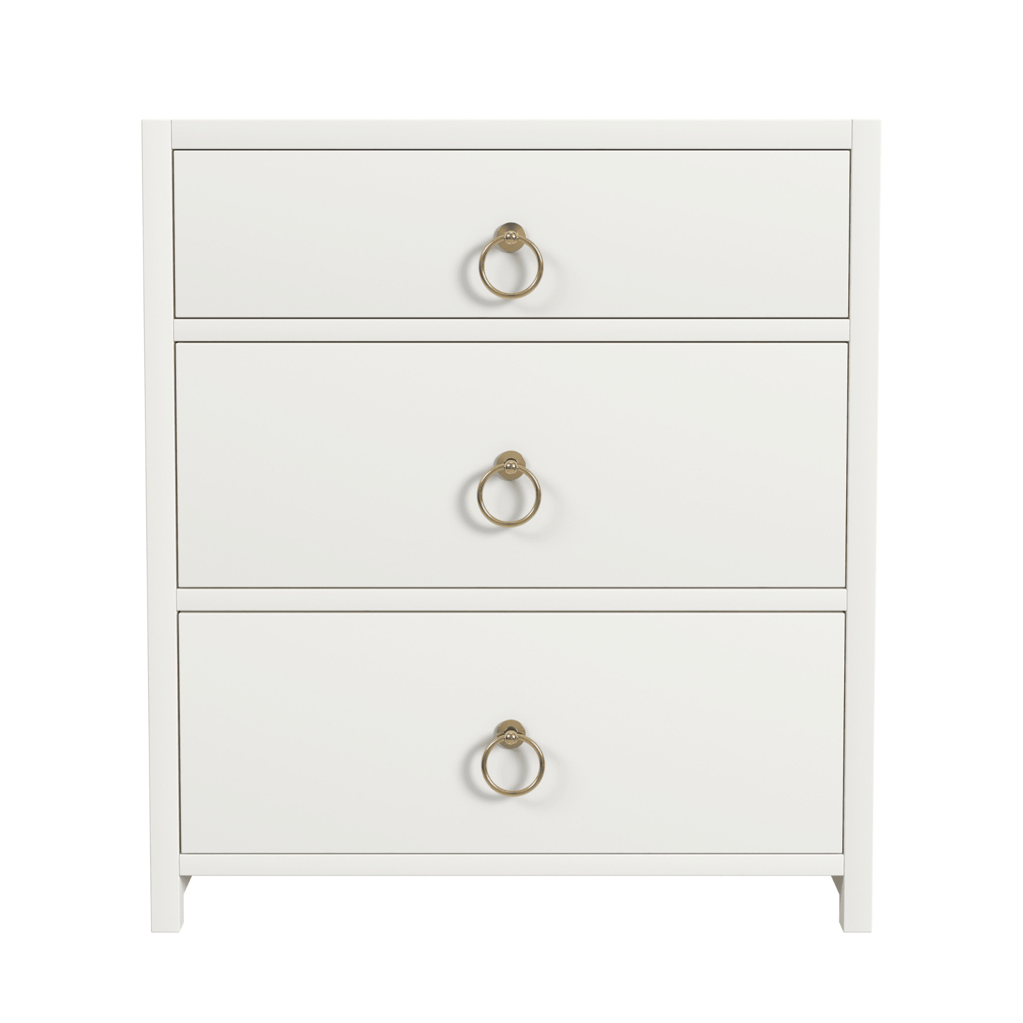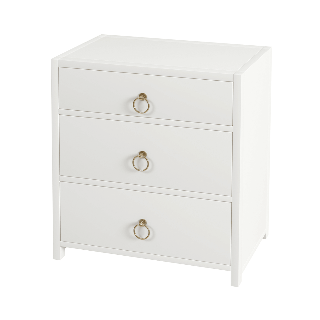 Crafted from Acacia wood and manufactured wood this three drawer nightstand features gold ring pulls, ball bearing glides, tongue and groove joinery. The gorgeous smooth white finish adds to this modern piece. Add this to your bedroom or guestroom for extra storage. Some assembly required. Click images for greater detail.