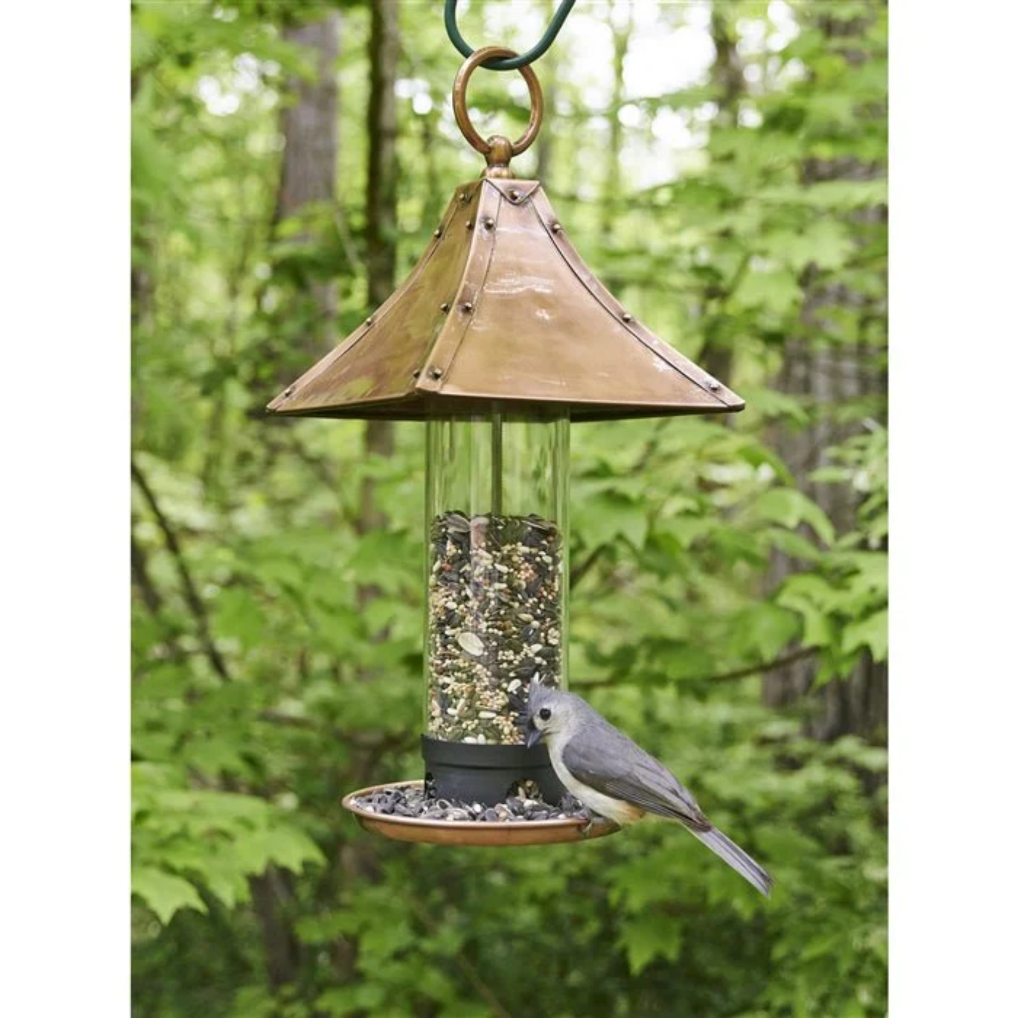 Welcome to the Zen garden, where tranquility reigns supreme. And what better way to enhance your oasis than with this eastern-inspired Pagoda bird feeder. Embellished with distinctive rivets that add an elegant touch to its already graceful design, it’s built to last with heavyweight plexiglass and a 22-gauge, pure copper, polished roof. The feeder is sized to hold 1.3 pounds of seed with drainage holes to keep seeds dry. The overhang also provides our feathered friends with rain and sun protection for a peaceful dining experience! Click images for greater detail.