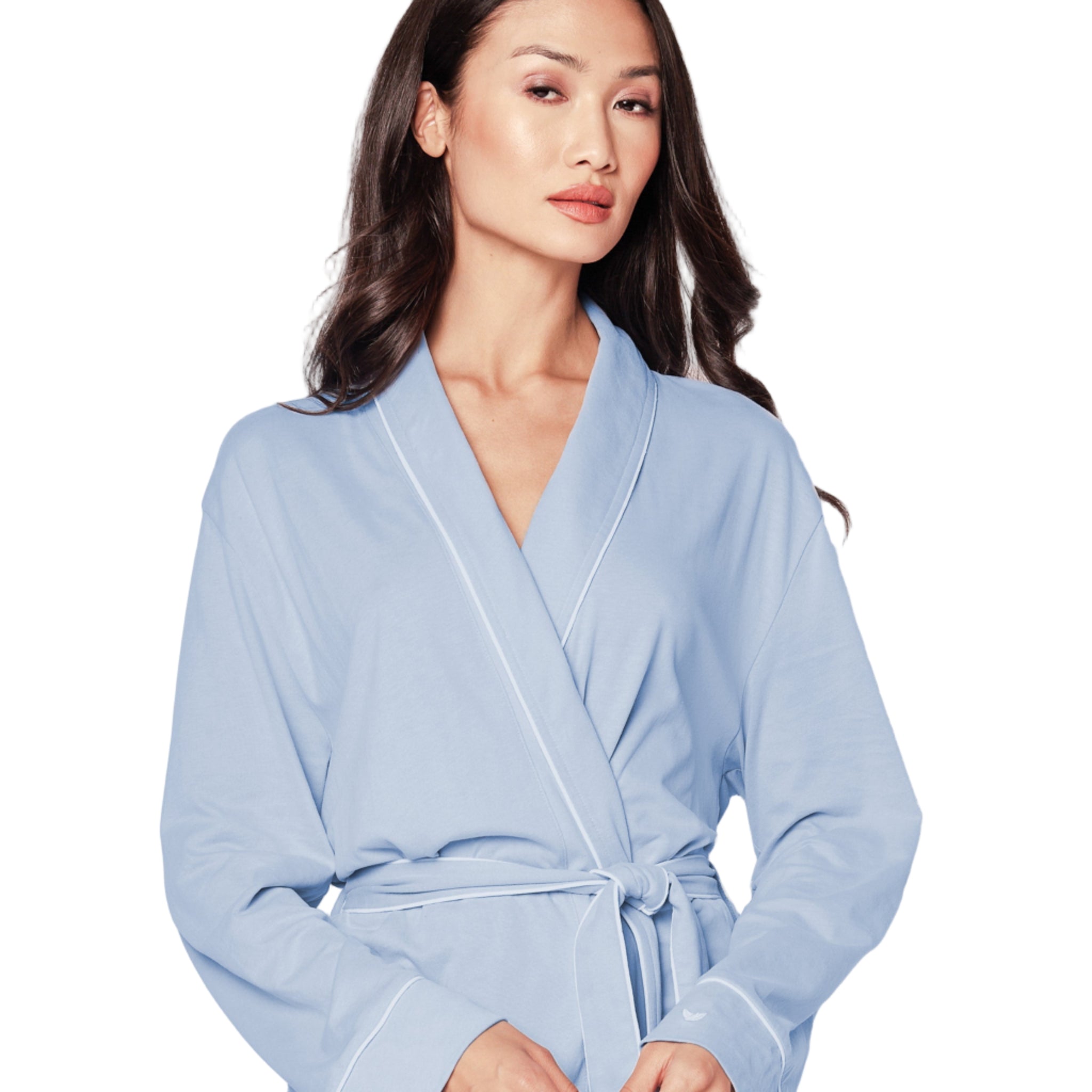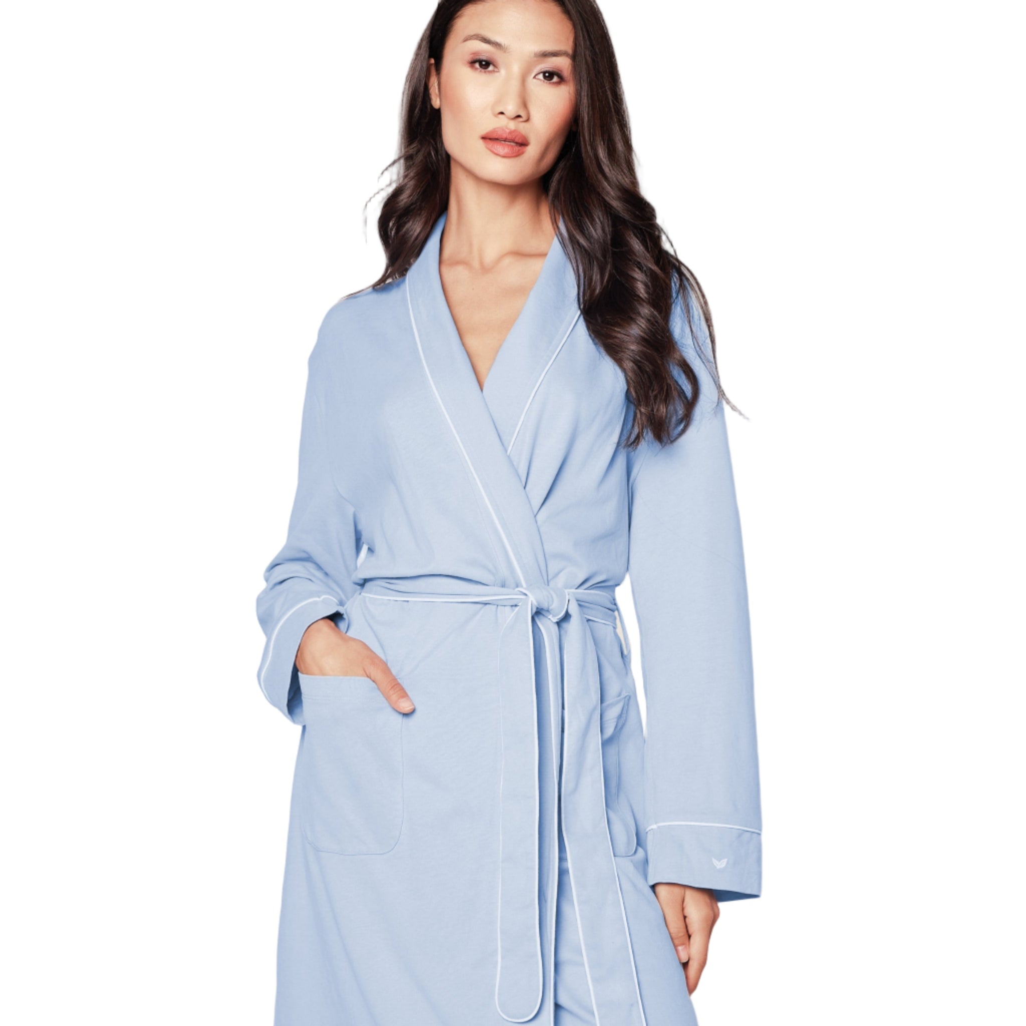 At the tippy top of the cotton jersey pecking order is 100% Peruvian Pima cotton. Our Pima Collection is sewn from this exquisite fabric: luxurious, supple jersey knit pajamas that drape beautifully and continue to soften with each washing. Buttery and smooth, yet breathable, this collection is yarn-dyed to prevent fading and is destined to become a fixture of your soothing bedtime ritual. The piece de resistance of pajamas: the perfect supple luxury pima robe. Length falls below the knee for ease of movement and includes all the lovely details (chic piping on the cuffs, generous sash) that grace our classic pajama silhouettes.
