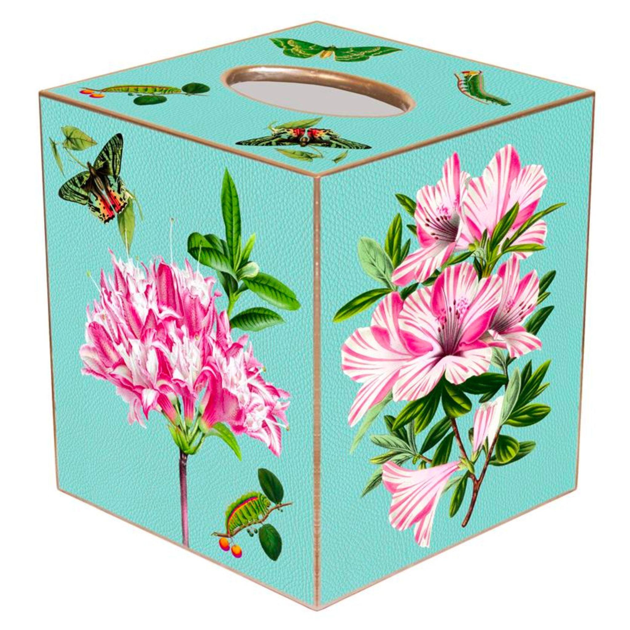 This is a handmade decoupage tissue box cover featuring pink azaleas on an aqua background.