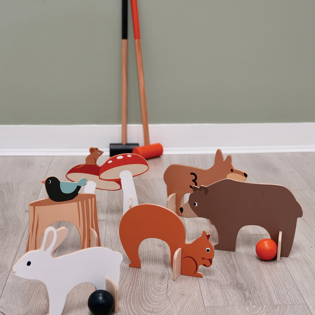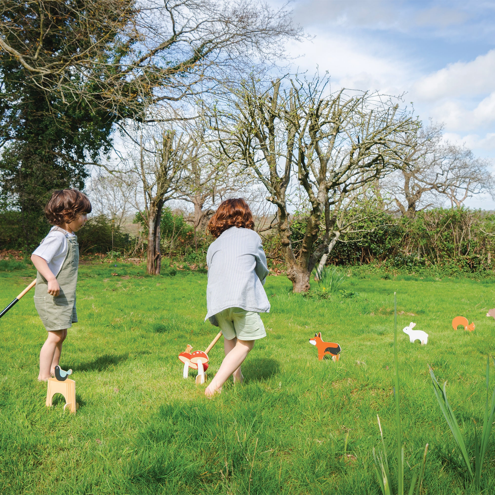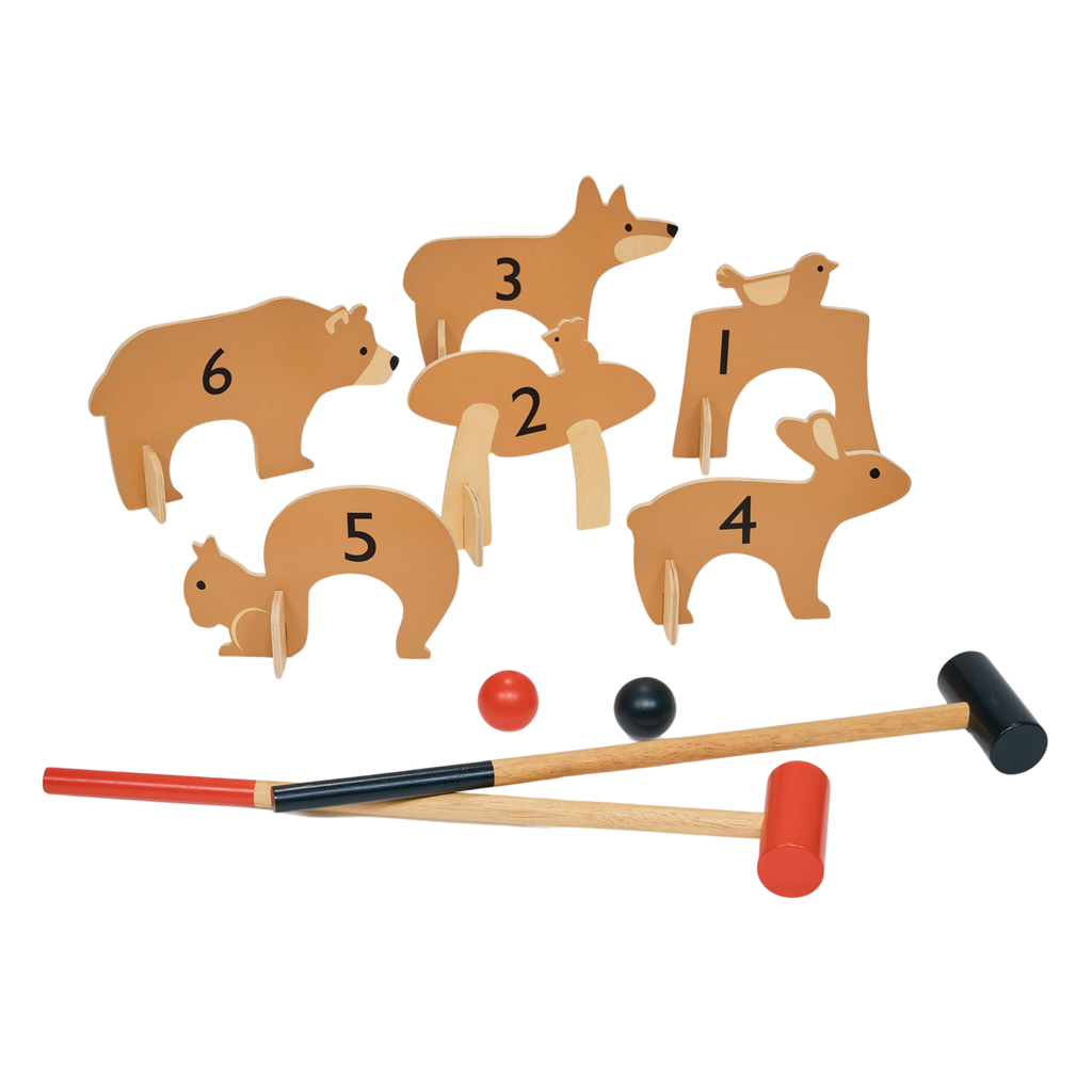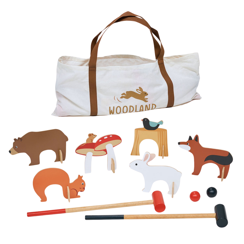 Contained in a practical printed canvas bag with shoulder handle, 6 colourful, illustrated woodland themed croquet hoops, 2 wooden croquet mallets, and 2 wooden painted balls. A squirrel, a rabbit, a bear, a fox, a tree trunk with bird, a toadstool with a mouse, can all be arranged to resemble a forest glade. Perfect for 2 players, aim the ball through the hoops and use the number on the back of each piece to add up your scores.