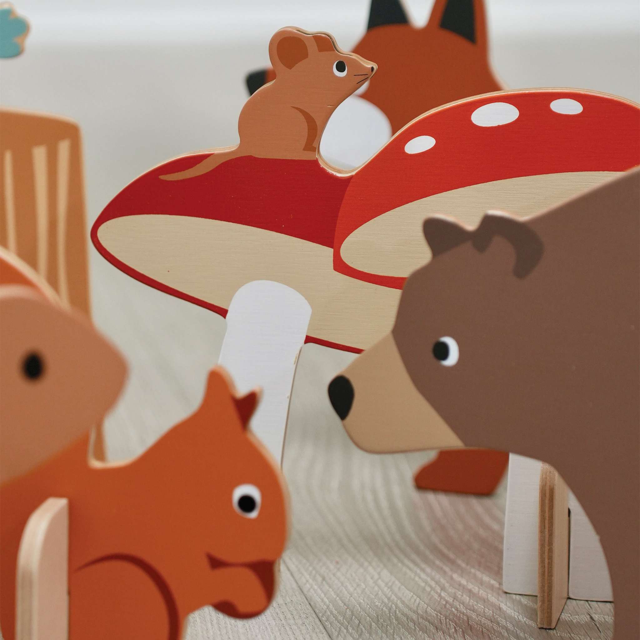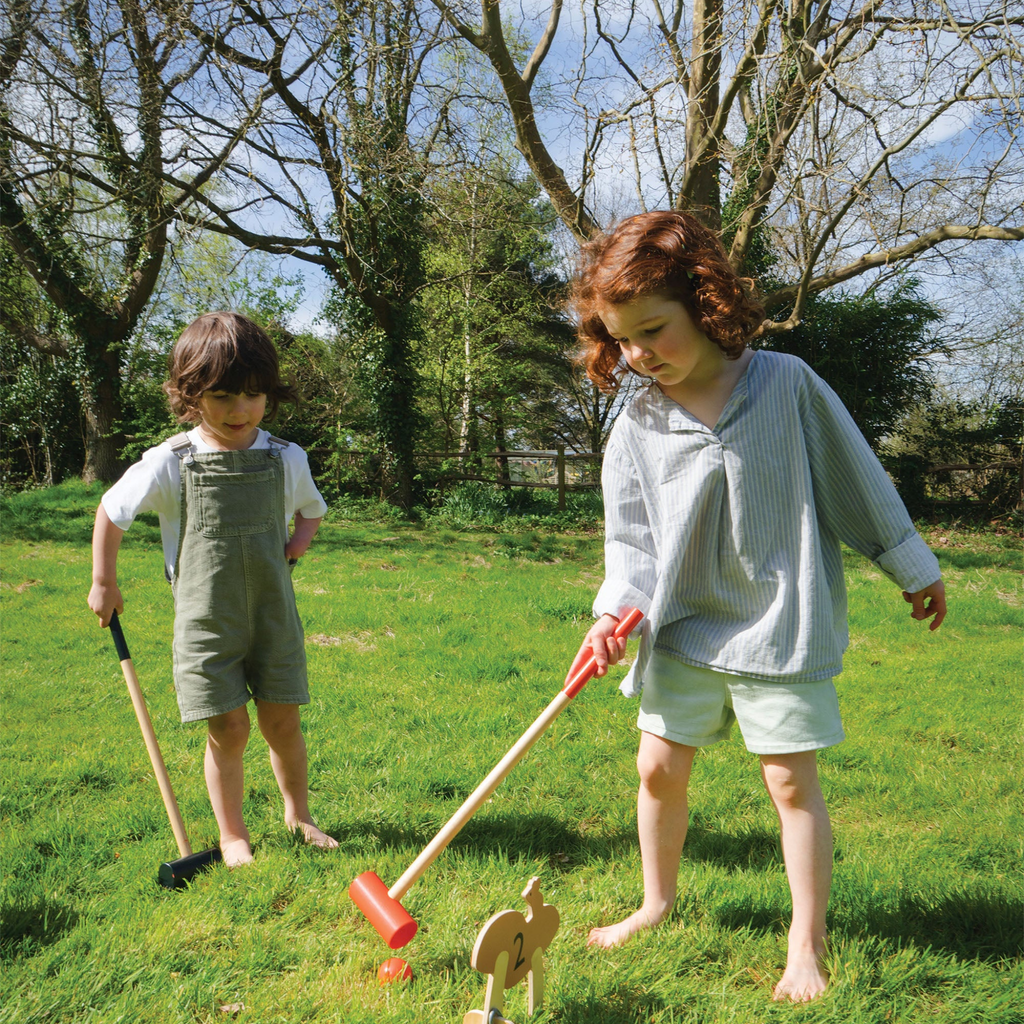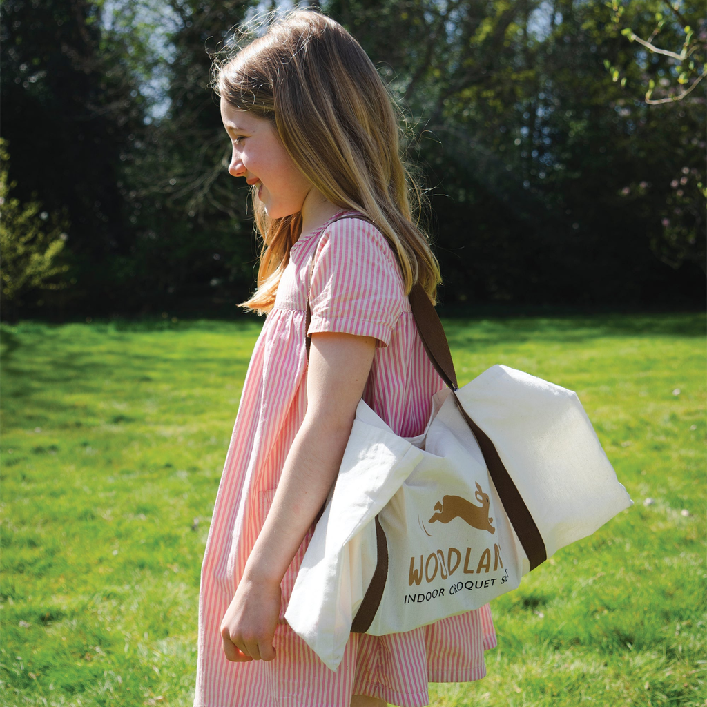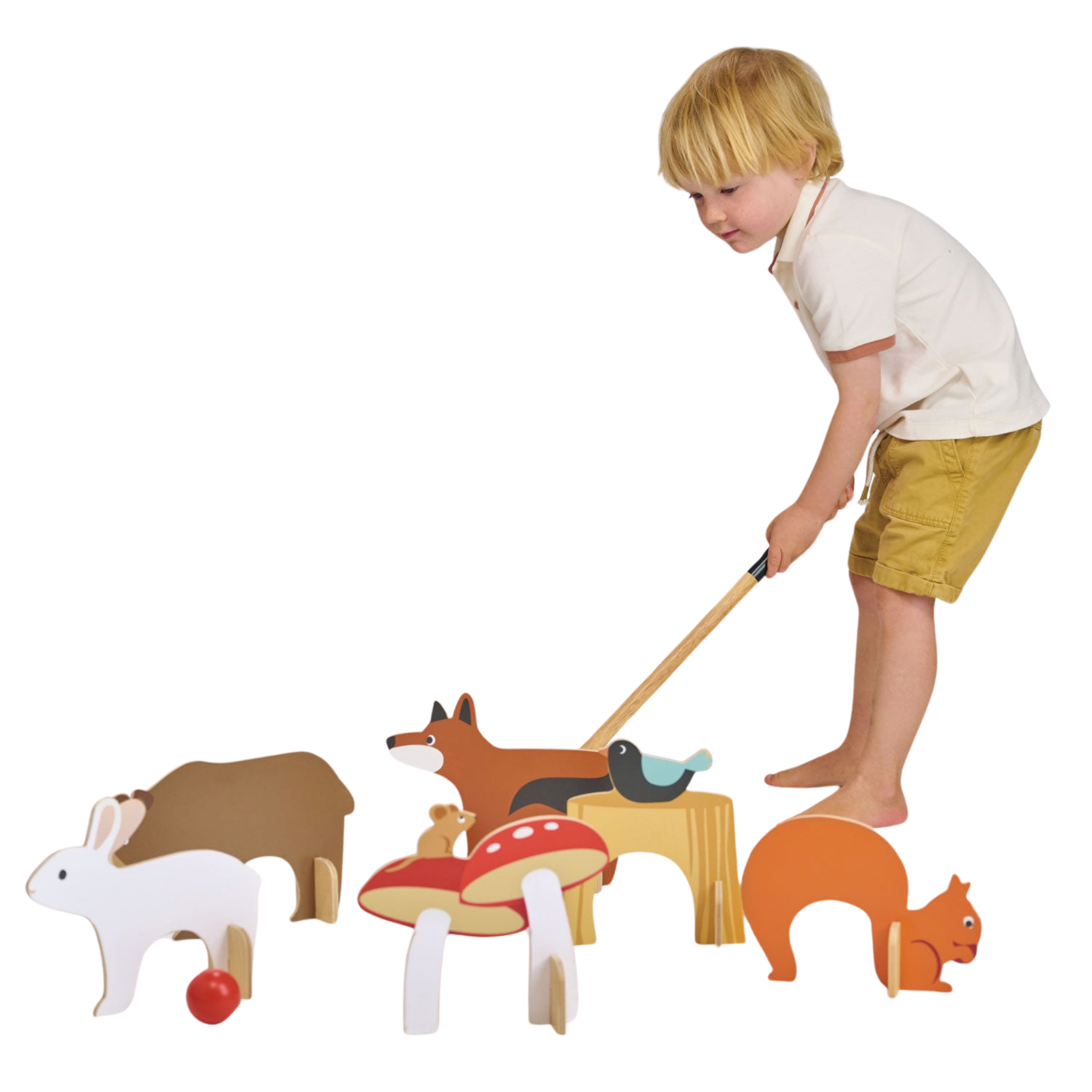 Contained in a practical printed canvas bag with shoulder handle, 6 colourful, illustrated woodland themed croquet hoops, 2 wooden croquet mallets, and 2 wooden painted balls. A squirrel, a rabbit, a bear, a fox, a tree trunk with bird, a toadstool with a mouse, can all be arranged to resemble a forest glade. Perfect for 2 players, aim the ball through the hoops and use the number on the back of each piece to add up your scores.